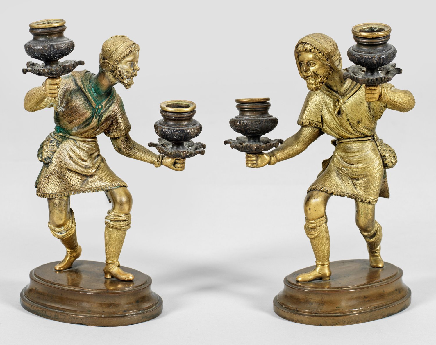 Gegenstücke. 2-flg.; Bronze, patiniert. Über ovalem Profilsockel vollplastische Darstellung von Jägern in historisierendem Gewand als Träger für vasenförmige Tüllen. H. 23,5 cm.