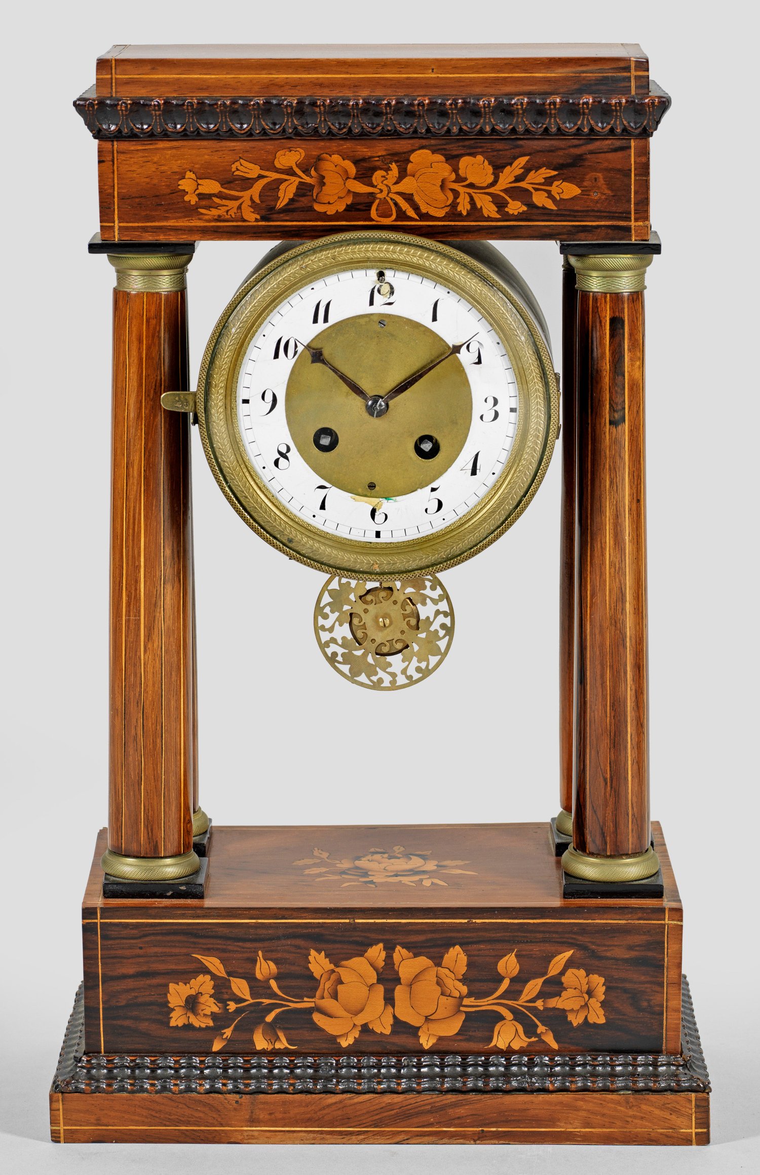 Palisander, furniert. Architektonisch gegliederter Korpus aus Vollsäulen als Träger für rundes Uhrengehäuse mit besch. Ziffernring. Pendulenwerk mit Pendelfeder und Halbstundenschlag auf Glocke. H. 41 cm. 25 cm x 13 cm.