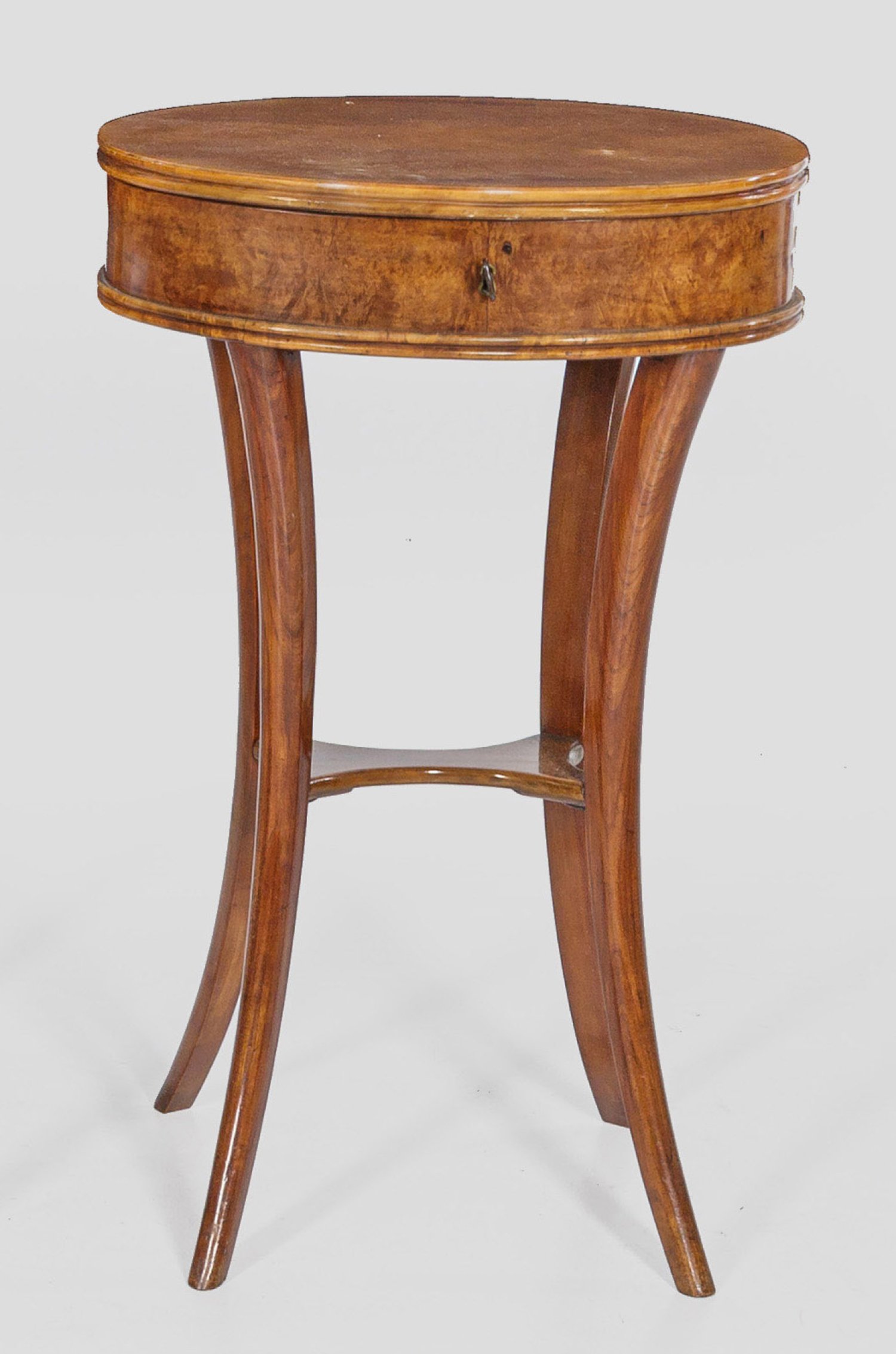 Kirschbaum und Birkenmaser, furniert. Bombierter, umlaufend profilierter Zargenkasten auf stark konkav eingezogenen, konisch verlaufenden Beinen, unterhalb durch schmalen Steg verbunden. Ovale, aufklappbare Deckplatte. Unterhalb Facheinteilung mit herausnehmbarer Schatulle. H. 74 cm. 47 cm x 36,5 cm.
