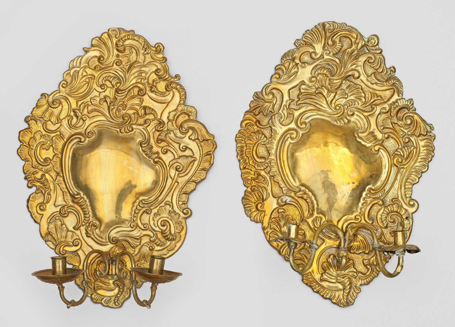 2-flg.; Messing. Kartuschenförmiges, asymmetrisch gestaltetes Wandschild aus erhaben reliefierten Volutenmotiven und Muschelwerk. Unterhalb davon ausgehend stark geschwungene Leuchterarme mit zylinderförmigen Tüllen über tief gemuldeten Traufschalen. H. 51 cm.