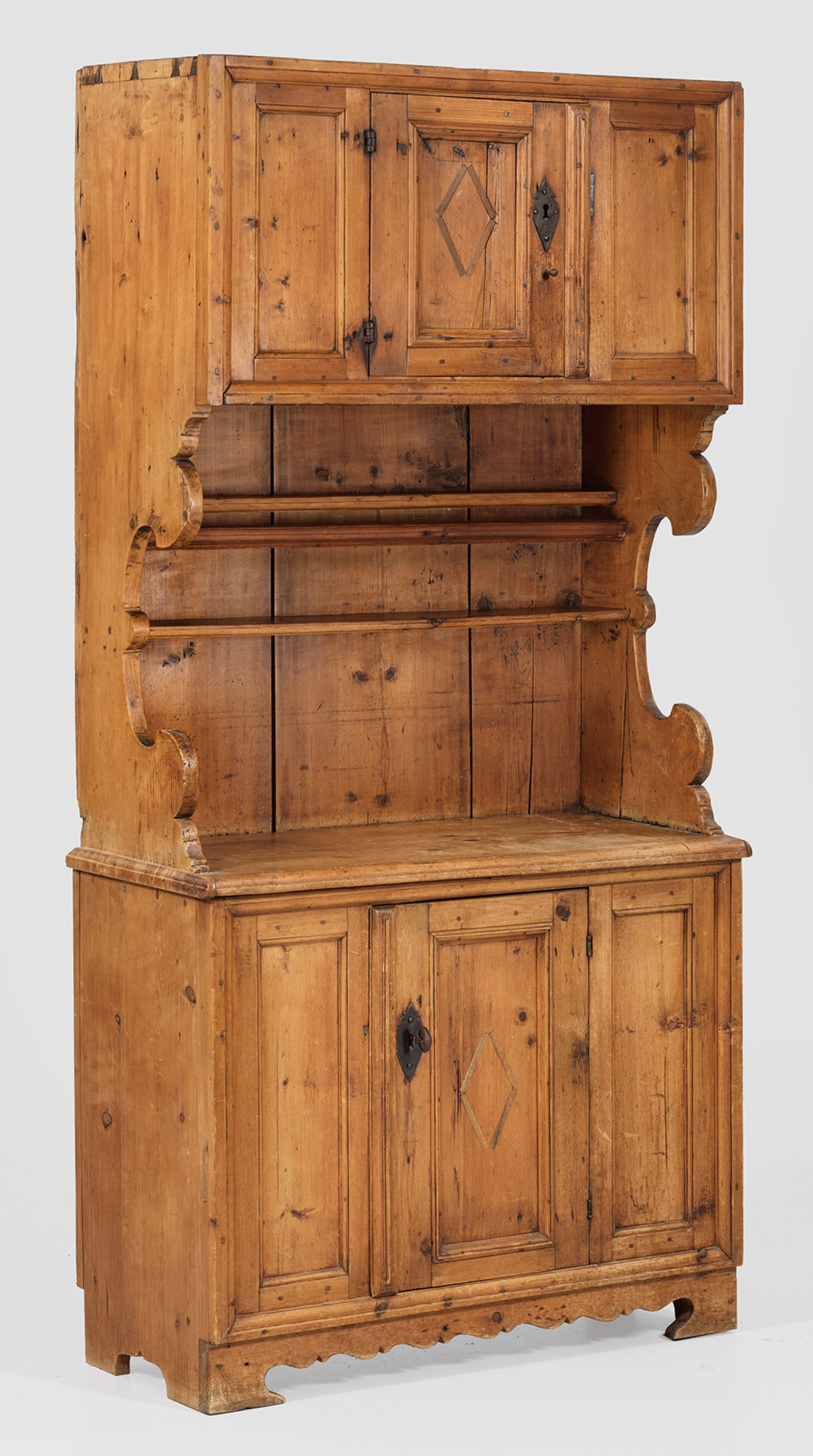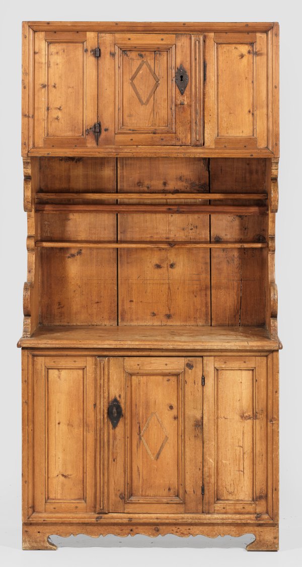 Weichholz. Gerader, querrechteckig angelegter Korpus auf gesägter Zarge und entsprechenden Füßen. In der gegliederten Front zentrale Tür. Hoher, korrespondierender Aufsatz mit passig geschweiften Seitenwangen und Tellerbord. H. 195 cm. 97 cm x 43 cm.