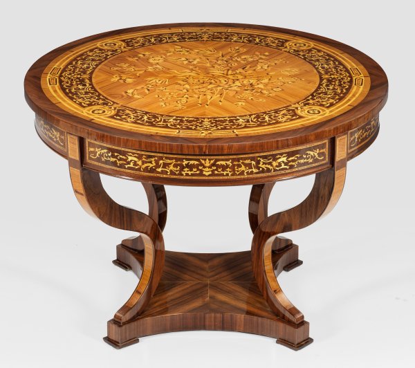 Nussbaum, furniert sowie Einlagen aus unterschiedlichen Edelhölzern. Über konkav eingezogener Sockelplatte stark geschwungene Beine als Träger für bombierte Zarge und runde Deckplatte. Flächendeckend breit gerahmte und von Bandeinlagen begrenzte Furnierfelder mit reichem Dekor aus Blattranken und Blüten. H. 76,5 cm. D. 109 cm.