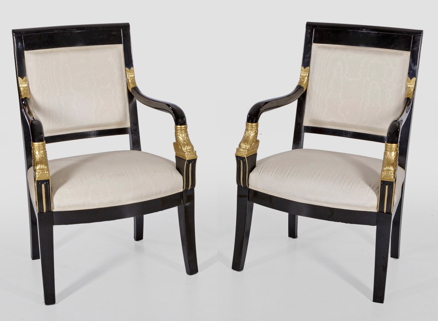 A pair of French black and partly gold lacquered Empire style armchairs.