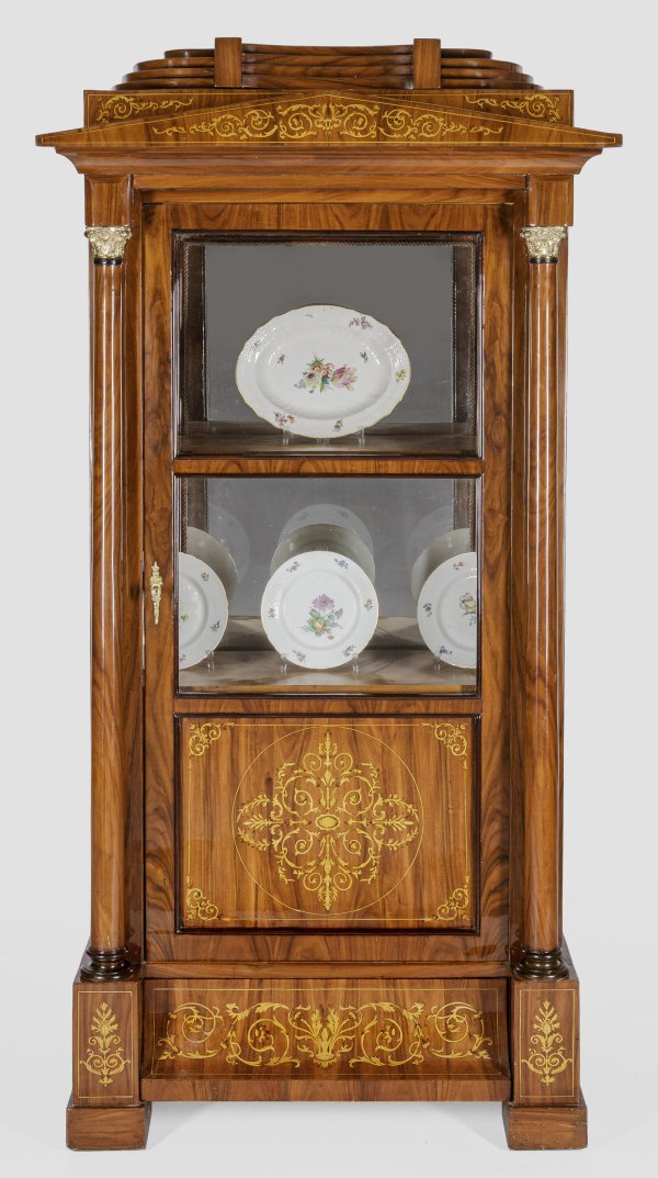 Nussbaum, furniert. Gerader, hochrechteckiger, dreiseitig verglaster Korpus, flankiert von eingestellten Säulen auf einschübigem Zargensockel. In der gegliederten Front eine Vitrinentür. Gestuft ansteigender, einschübiger oberer Abschluss mit Schinkelgiebel. Kontrastierende Einlagen aus Blattvoluten. H.186,5 cm. 96 cm x 55,5 cm.