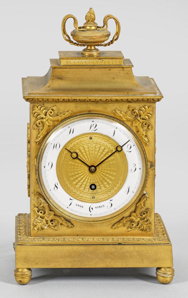 Bronze. Rechteckiger Korpus auf flachem Sockel mit Palmettenfries. Verglastes Zifferblatt mit Emailziffernring, bez. ANDR. HUBER. Werk mit Echappement bez. Lenzkirch. H. 31 cm.