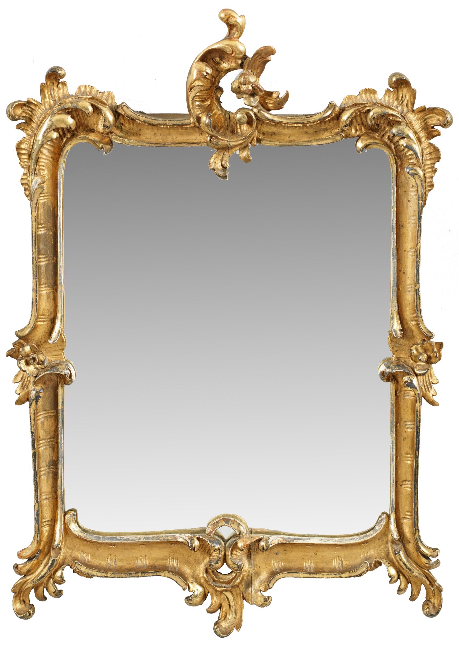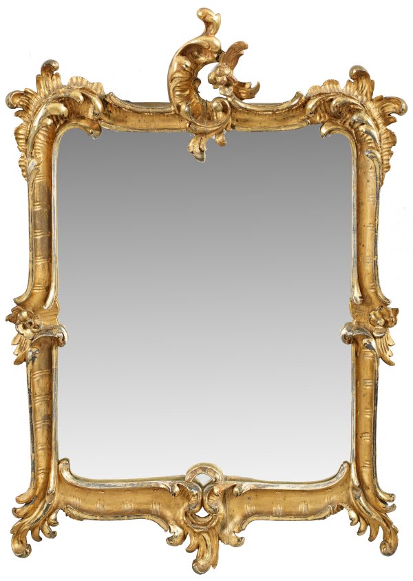 Holz, geschnitzt, gefasst und vergoldet. Hochrechteckige Spiegelrahmung aus gegenläufigen Voluten, Muschelwerk und Blüten. Asymmetrisch gestaltete, durchbrochen gearbeitete Rocaillenbekrönung sowie korrespondierender unterer Abschluss. 60 cm x 44 cm.