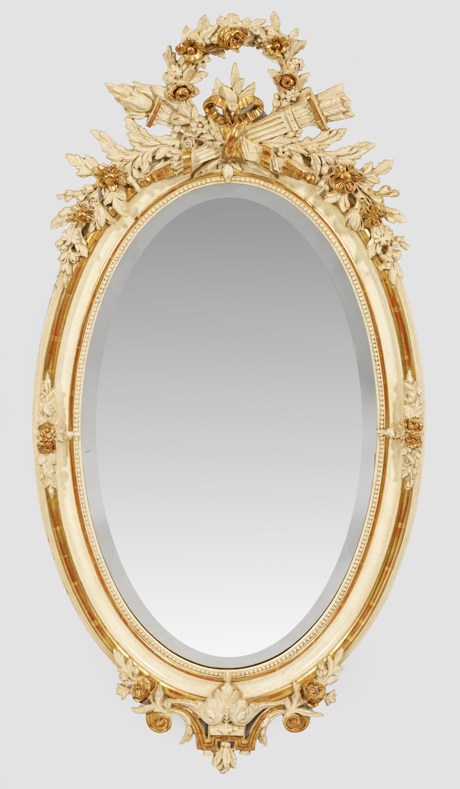 Stuckiert, elfenbeinfarben gefasst und teilw. vergoldet. Hochovale, profilierte Spiegelrahmung mit Perlstab. Durchbrochen gearbeitete Bekrönung aus kranzartig angeordneter Blütengirlande und Köchermotiven. Facettiertes Spiegelglas. 119 cm x 60 cm.