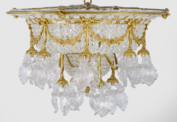 14-flg.; Bronze, vergoldet und farbloses Glas. Gestuft ansteigendes, kuppelförmiges Plafond aus schmalen Stegen und dicht angeordneten Prismen, umgeben von schlanken Festons als Träger für blütenförmige Leuchtmittel. Innen vier weitere Lampenfassungen. Elektrifiziert. H. 53 cm. D. 75 cm.
