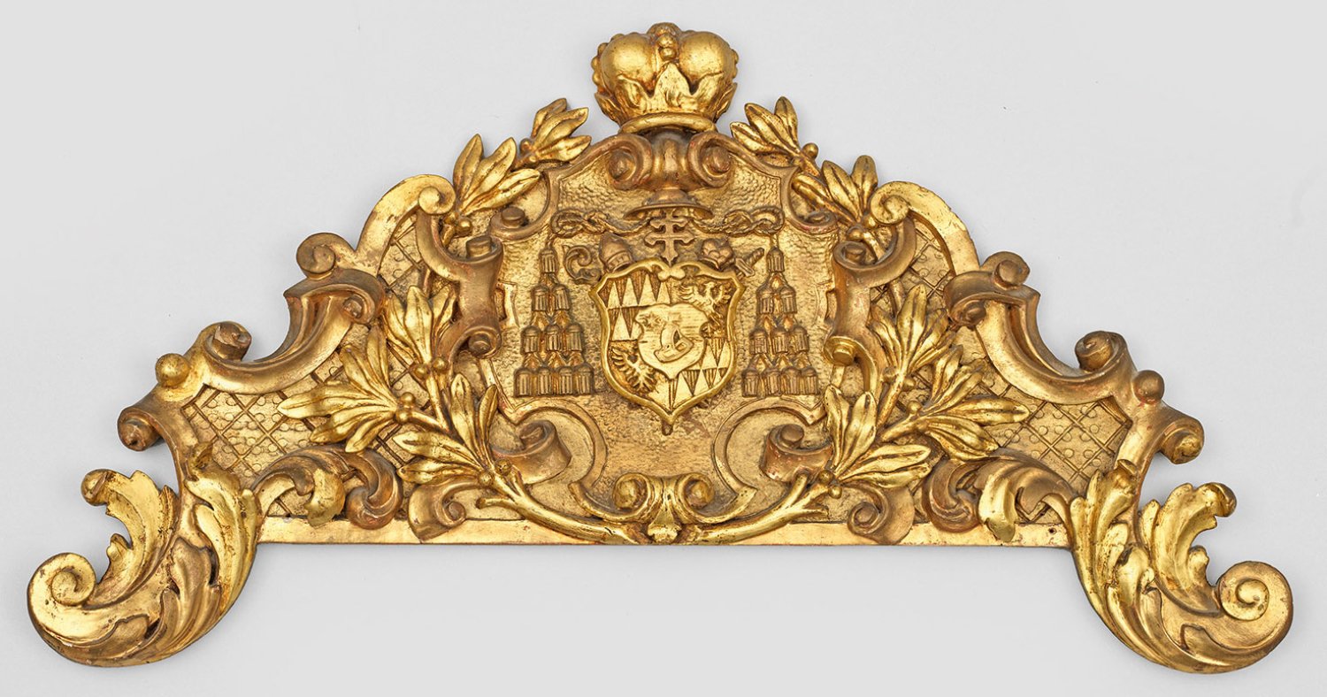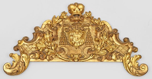 Holz, geschnitzt und vergoldet. Geschweift ansteigendes Wandschild aus gegeneinander gestellten Voluten, Blatt- und Gitterwerk. In der Mitte, korrespondierende Reserve mit zentraler Wappenkartusche, umgeben von Quasten. 34 cm x 65 cm.
