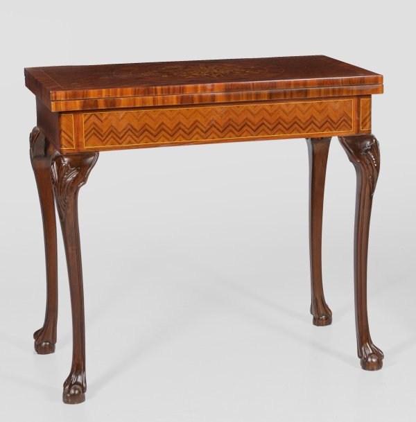 Nussbaum, furniert, Gerader, rechteckiger Zargenkasten auf geschweiften, blattreliefierten Beinen mit Klauenfüßen. Gering überstehende, aufklappbare Deckplatte. Unterhalb eingelegte Spielfläche. Flächendeckend teilw. mosaikartig angelegte Furnierfelder sowie große Blütenintarsie. H. 76 cm. 81 cm x 48,5 cm bzw. 98 cm x 81 cm.
