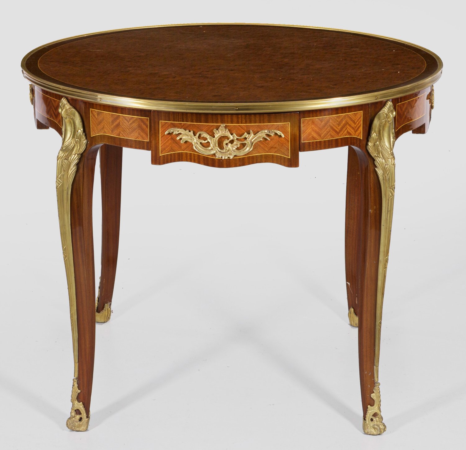 Mahagoni, furniert sowie Applikationen aus Bronze. Bombierter einschübiger Zargenkasten auf hohen geschwungenen und sich verjüngenden Beinen als Träger für runde, profilgerahmte Deckplatte aus Rautenmarketerie. H. 80,5 cm. D. 100 cm.