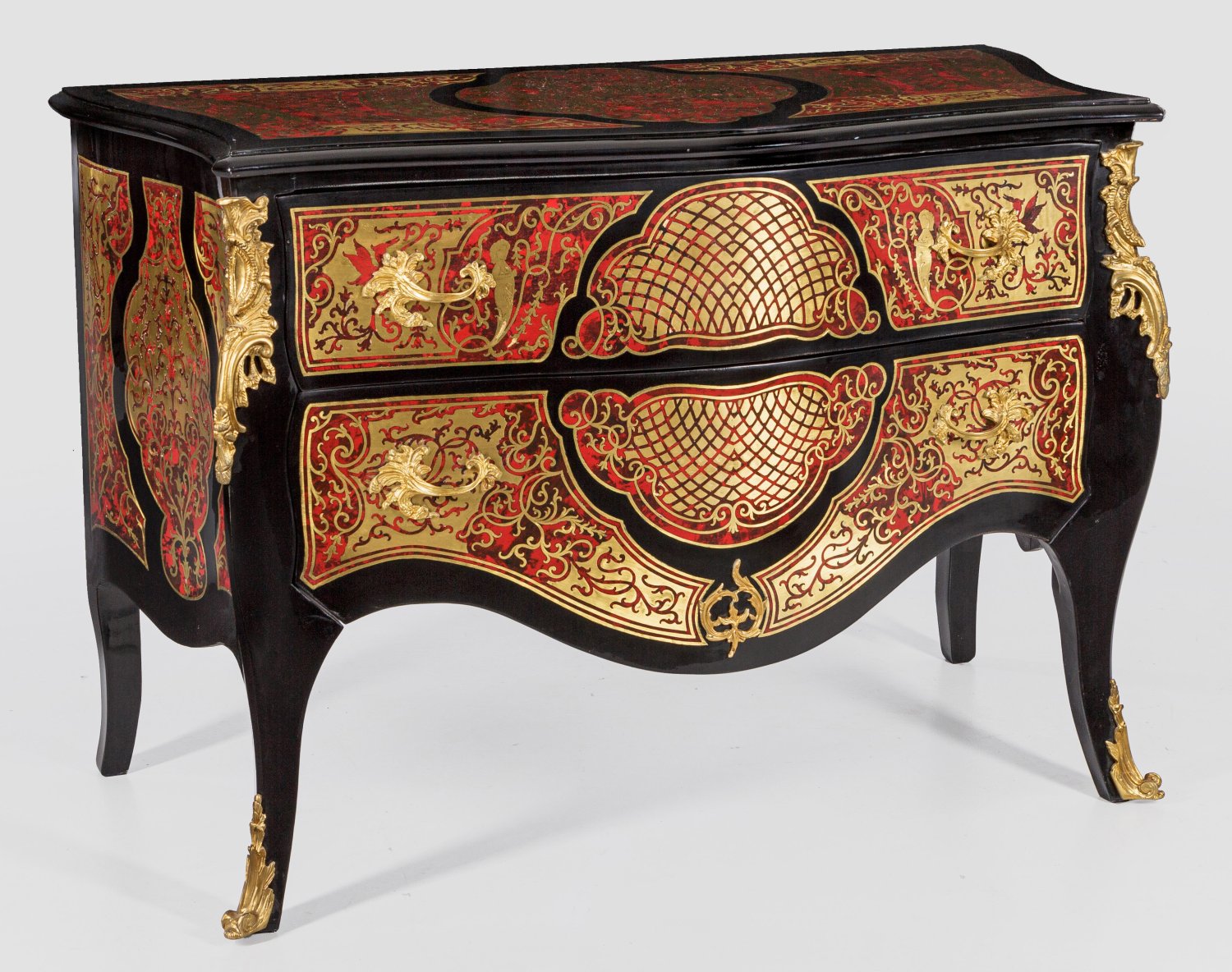 Holz, schwarz lackiert sowie große Reserven aus ornamentiertem Messing und rotem Lack in sog. Boulle-Technik. Dreiseitig bombierter Korpus flankiert von weit ausgezogenen, schmalen Ecklisenen in ausgestellte Beine übergehend. In der gegliederten Front zwei breite Schubladen sans traverse. Gering überstehende Deckplatte. H. 87,5 cm. 128 cm x 63 cm.