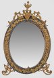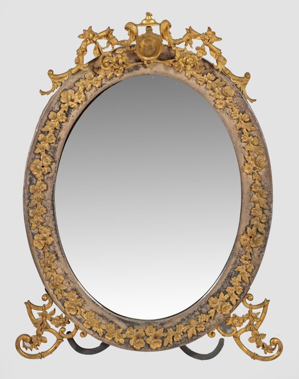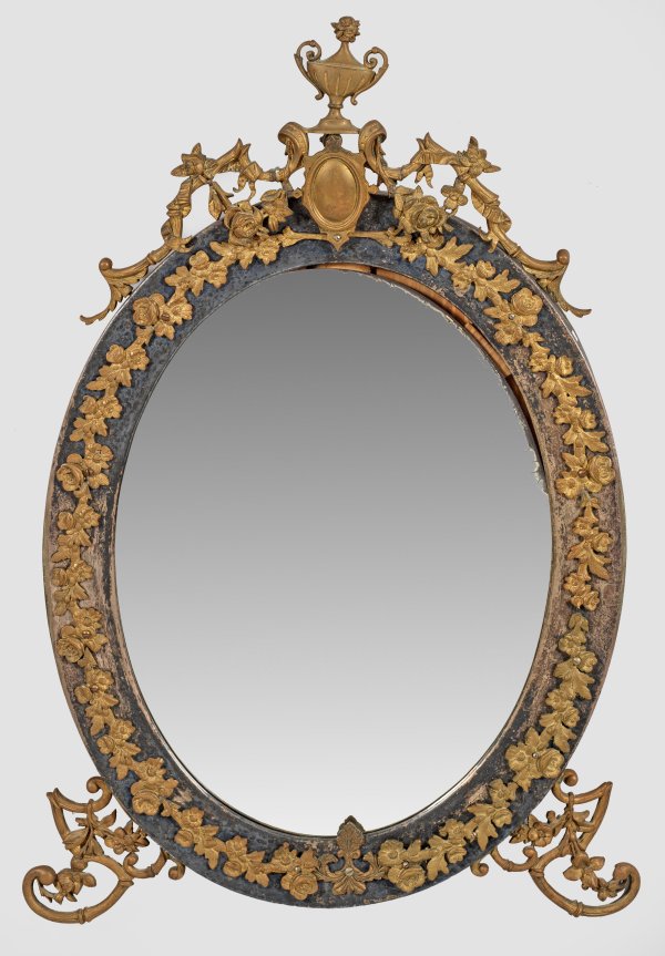 Messing und Bronze, teilw. versilbert. Hochovale Rahmung umlaufend mit applizierten Blüten und Blattmotiven. Durchbrochen gearbeitete Bekrönung mit zentralem Medaillon und Vase. Unterer Abschluss aus Voluten. Facettiertes Spiegelglas. 1x mit rückseitigem Aufsteller. Altersspuren. 83 cm x 51 cm.