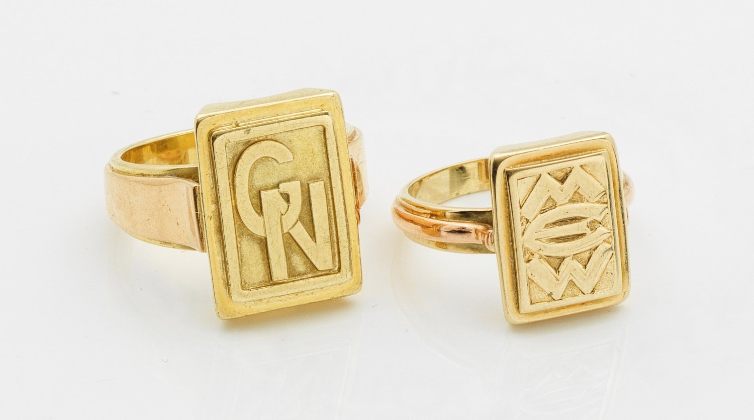 Gelb- und Roségold, gest. 585. Rechteckige, profilierte Ringköpfe mit Monogrammrelief. Eine Ringschiene bicolor gearbeitet. Ges.-Gew. ca. 21,22 g.