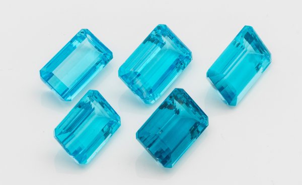 5 ungefasste London Blue Topase im Tafelschliff von zus. ca. 250 ct.; Ges.-Gew. ca. 54,53 g.