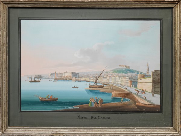 Detaillierte, durch Personen- und Schiffsstaffage belebte Vedute der Bucht von Neapel in sanftes, warmes Abendlicht getaucht. Klassische Darstellung der Neapolitanischen Vedutenmalerei des 19. Jahrhunderts aus dem Umkreis von Vincenzo Ferri (1787 - 1869), Gioacchino la Pira (act. 1839 - 1870) und Giuseppe Gustavo Scoppa (1856 - 1940). Gouache/Papier. Im Randbereich mittig betitelt. Darstellung 41,5 cm x 63 cm. Rahmen.