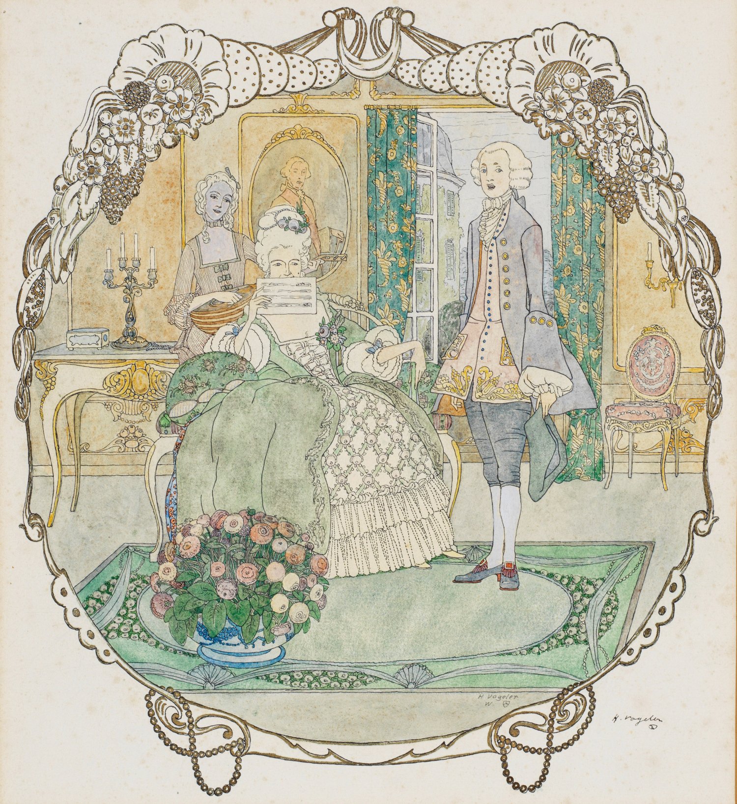 Vermutlich als Entwurf für eine Buchillustration geschaffen. Tusche und Aquarell/Bütten. R. u. zweifach sign. mit Worpsweder Wappenschild. Ger. fleckig. Passepartoutausschnitt 30,8 cm x 28 cm.