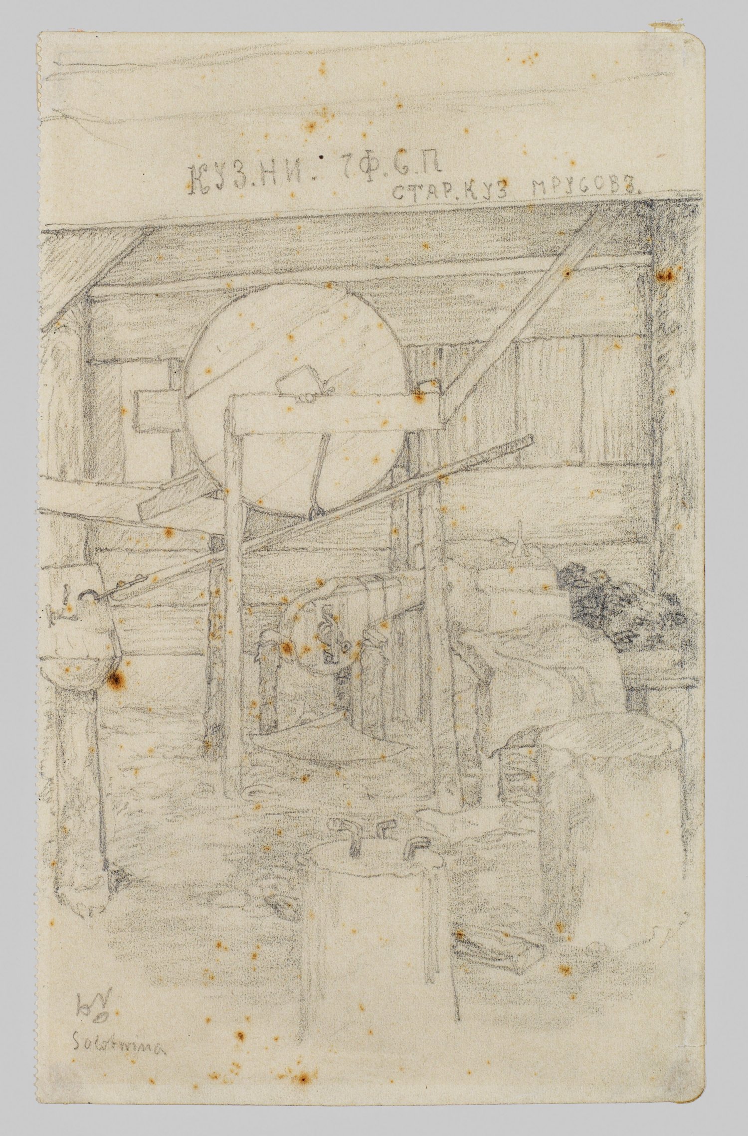 Travel sketch in pencil on paper. Monogrammed with initials and coat of arms. Inscribed with location Solotwina and title. Minor foxing.