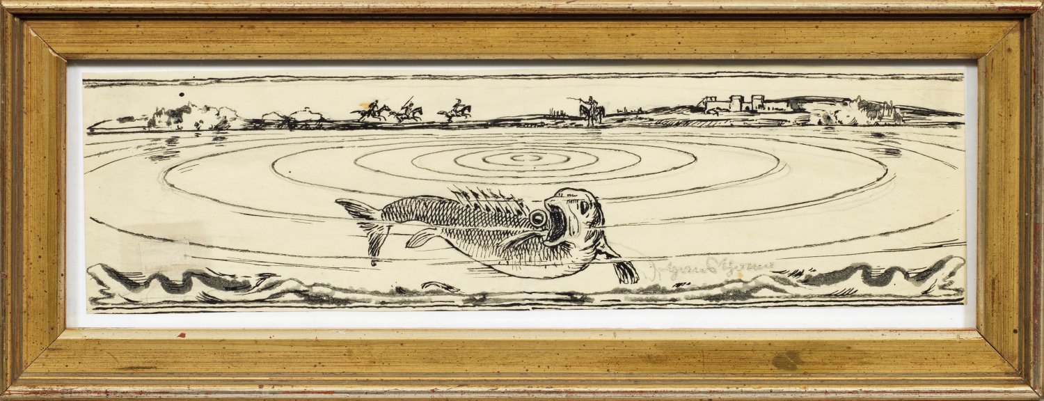 Wohl Entwürfe für Vignetten bzw. Illustrationen. Thoma, Maler, Zeichner und Grafiker teilw. fantasiereicher Darstellungen, schloss sich der Münchner Secession an und wurde 1899 Professor an der Karlsruher Kunstschule. Feder u. Tusche/Papier. Jeweils r. u. sign.; Ca. 7,5 cm-9 cm x 27,5 cm. Rahmen.