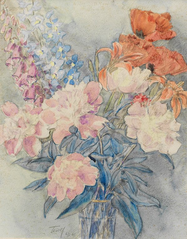 In einer Glasvase mit Goldrand der bunte Sommerblumenstrauß mit u. a. Rittersporn, Pfingstrosen und Tulpen. Tewes, der an der Münchner Akademie studierte, war Mitglied der Berliner Secession und der auf Initiative von Gustav Pauli gegründeten Bremer Künstlervereinigung "Die Goldene Wolke". Aquarell und Bleistift/Papier; L. unten sign. und datiert 1941. Ger. stockfleckig. Darstellung 48 cm x 38 cm (Passepartoutausschnitt). Rahmen.