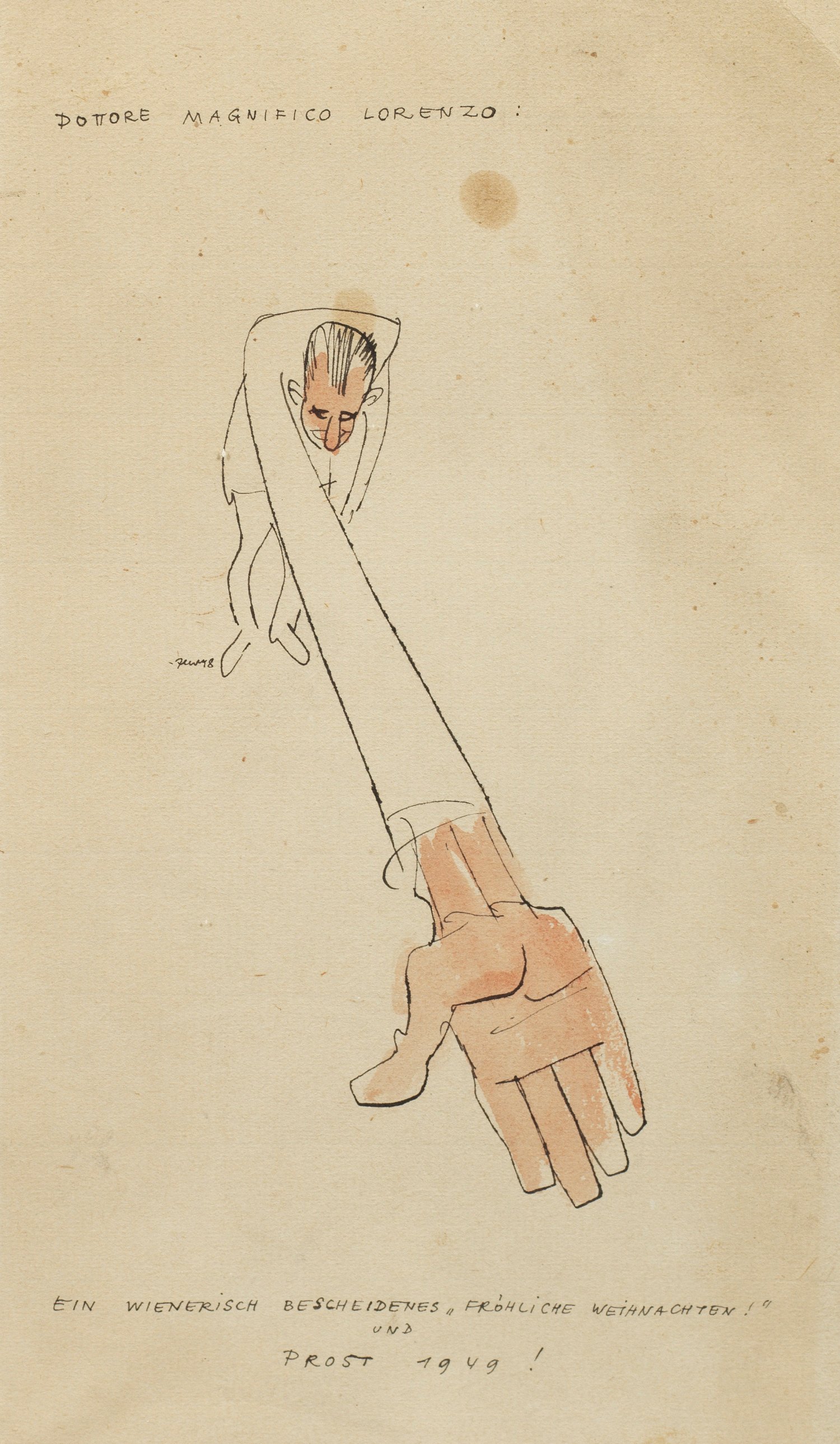 Tusche und Aquarell/Papier. L. mittig sign. u. dat. (19)48. Bez. "Dottore Magnifico Lorenzo: Ein Wienerisch bescheidenes "Fröhliche Weihnachten!" und Prost 1949!". Ger. nachgedunkelt u. fleckig. Ca. 28,5 cm x 16 cm. Rahmen.