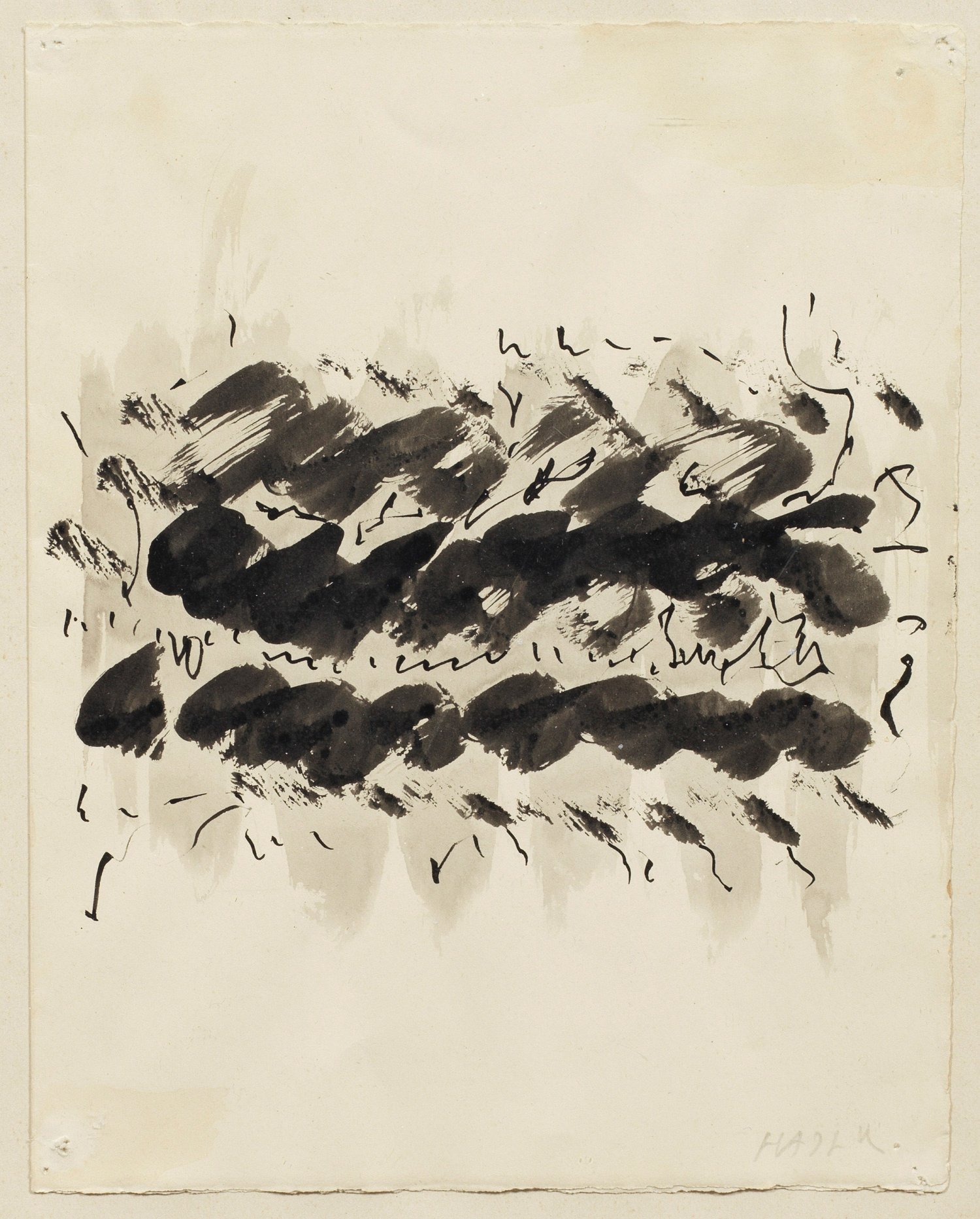 Abstrakte, an Wellen erinnernde Komposition Hajeks, der 1947 - 1954 Bildhauerei an der Staatlichen Akademie in Stuttgart bei Peter Otto Heim studierte und fast ausschließlich abstrakte Werke schuf. Hajek erlangte durch seine Teilnahme an der documenta II und III 1954/1964 größere Bekanntheit und wurde 1980 Professor an der Karlsruher Akademie. Teilw. lavierte Tuschzeichnung/Papier. R. u. sign.; Kl. Montierungsloch, ger. nachgedunkelt u. wellig. 18,7 cm x 14,8 cm. Rahmen.