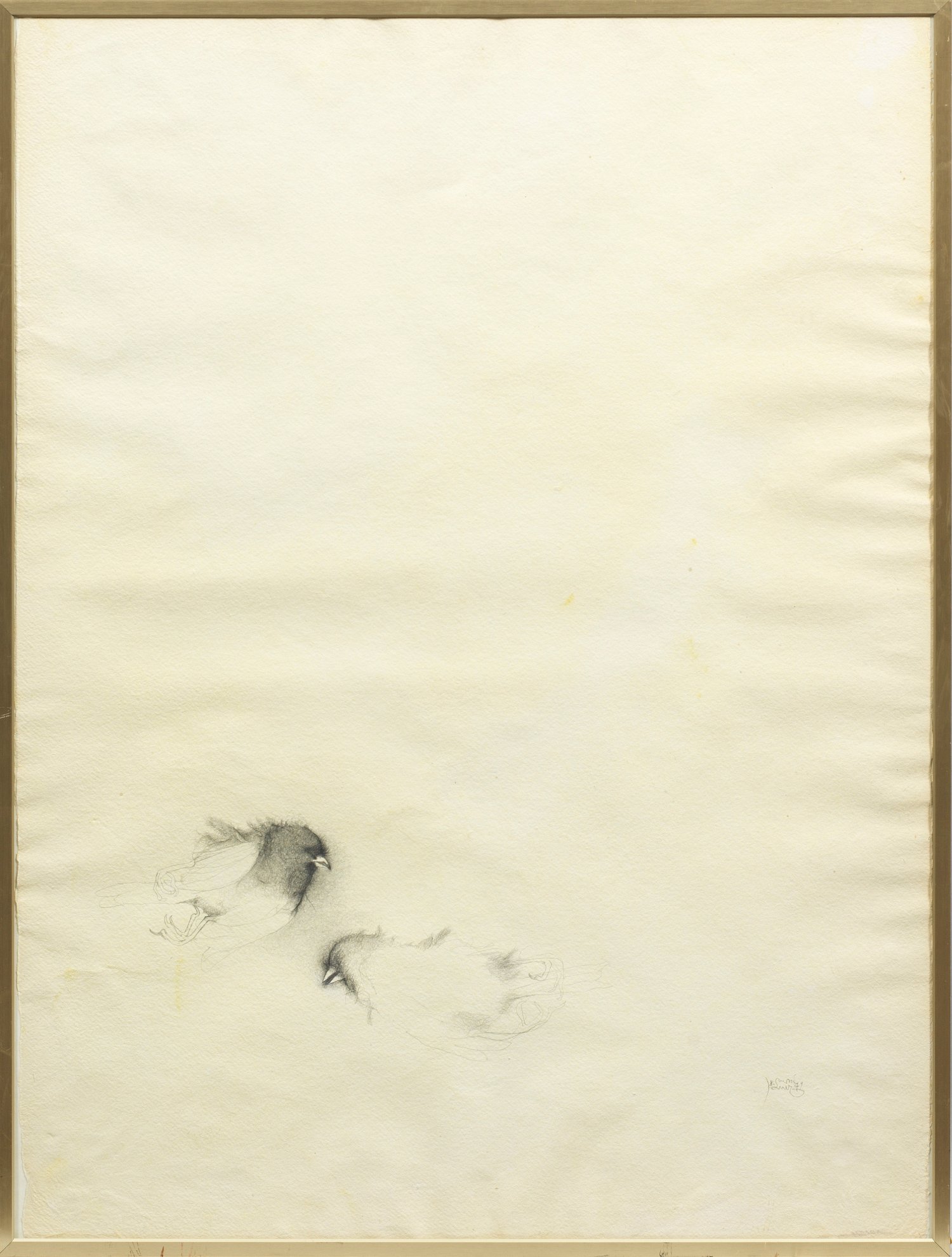 In flüchtigem Duktus gezeichnetes und stark reduziert komponiertes Tierstillleben Brunis, der 1952-1959 am Instituto d’Arte in Pesaro und 1961-1966 an der Hochschule für Bildende Künste in Hamburg bei Georg Gresko studierte. Bleistiftzeichnung, gelblich aquarelliert/Bütten. R. u. sign. u. dat. (19)78. Leichte Knitterungen. Blatt ca. 80 cm x 59 cm. Rahmen.