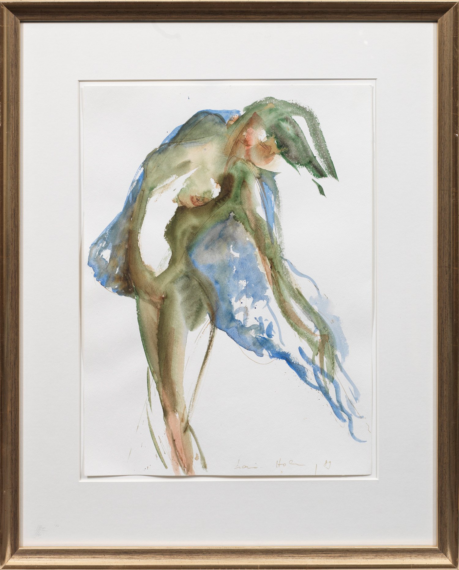 Dynamisch angelegte Aktstudie der Bremer Künstlerin, die bei Prof. Hans Degenhardt und Irmgard Dahms in Bremen Malerei und Zeichnung studierte. Aquarell/Bütten. R. u. sign. und dat. (19)89. Blatt 48 cm x 36 cm. Rahmen.