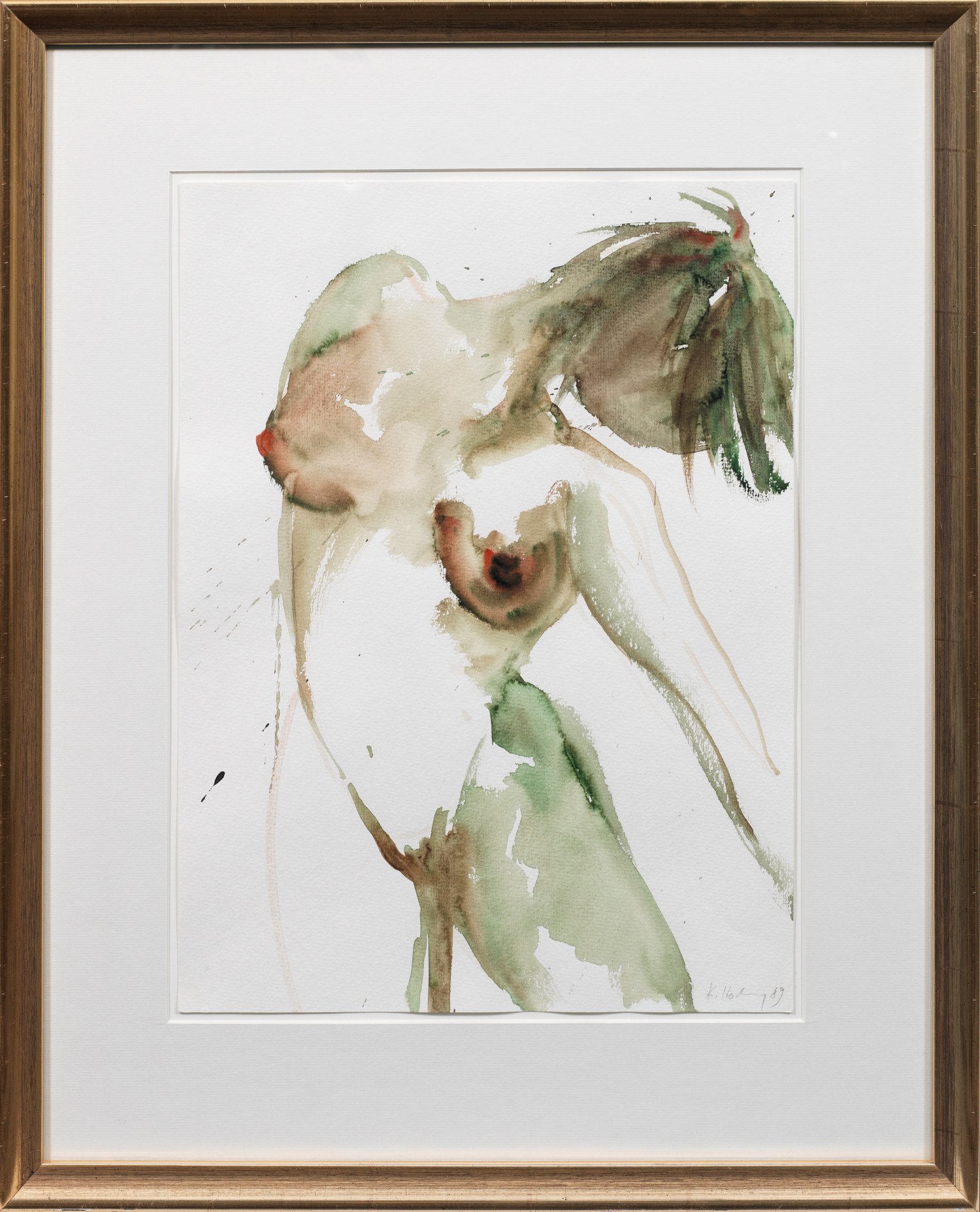 Dynamisch angelegte Aktstudie der Bremer Künstlerin, die bei Prof. Hans Degenhardt und Irmgard Dahms in Bremen Malerei und Zeichnung studierte. Aquarell/Papier. R. u. sign. u. dat. (19)89. Blatt 48 cm x 36 cm. Rahmen.
