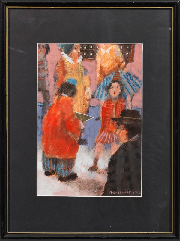 Der polnische Künstler Marczukiewicz studierte an der Akademie in Krakau Grafik, Malerei im Atelier von Prof. Zbyslaw Maciejewski und Lithographie bei Prof. Wlodzimierz Kunz. Öl/Papier. R. u. sign.; Darstellung 26,5 cm x 18,5 cm (Passepartoutausschnitt). Rahmen.