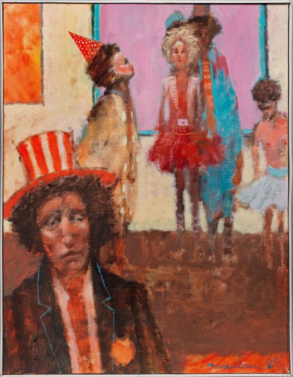 Der polnische Künstler Marczukiewicz studierte an der Akademie in Krakau Grafik, Malerei im Atelier von Prof. Zbyslaw Maciejewski und Lithographie bei Prof. Wlodzimierz Kunz. Öl/Lwd.; R. u. sign. und dat. (19)89, verso undeutl. Stempel wohl mit Monogr.; 90 cm x 70 cm. Rahmen.