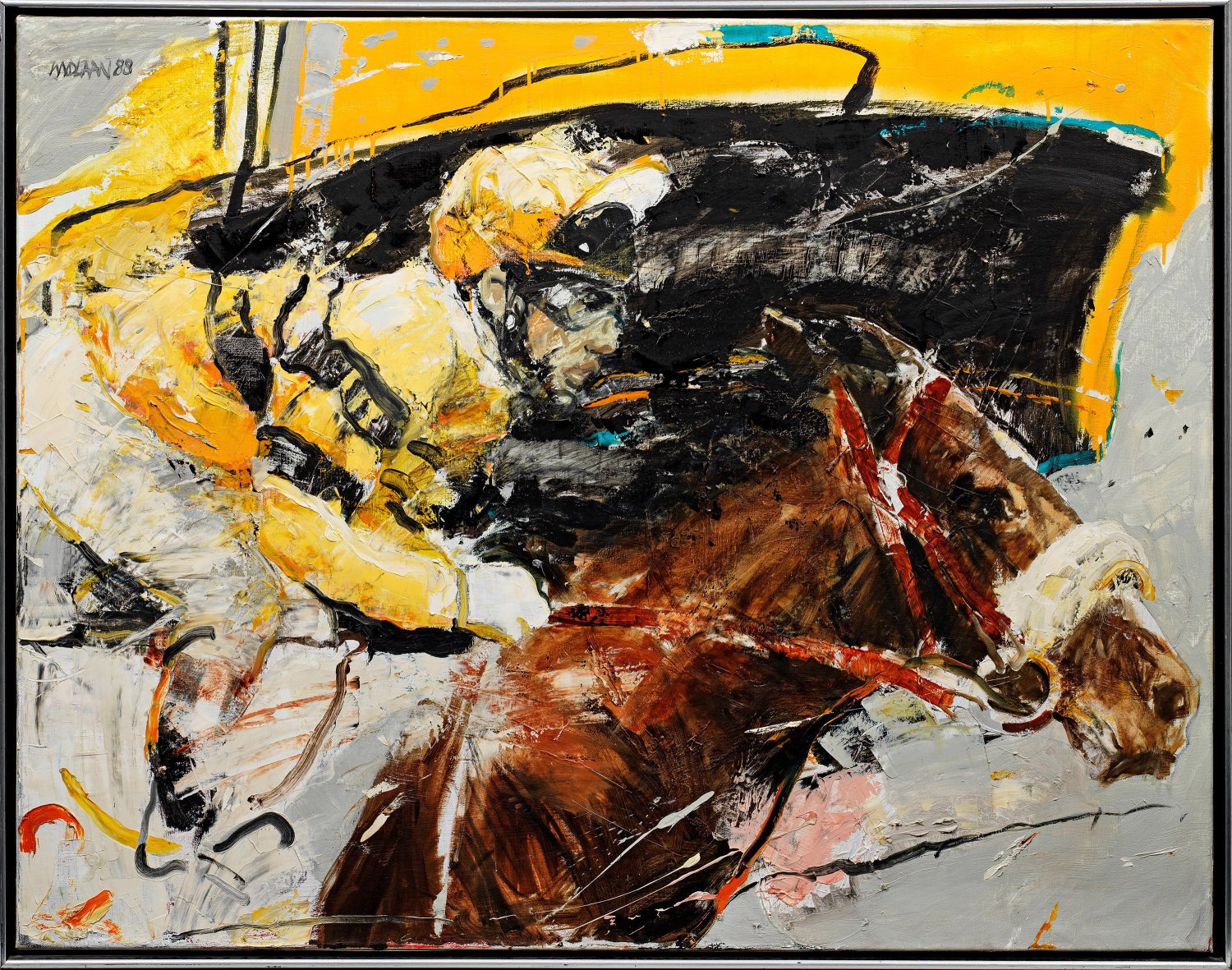 Frühes, expressiv-realistisches, mit furiosem Duktus gemaltes Werk des an der Kunstakademie in Maastricht ausgebildeten Malers und Bildhauers, dass die Flüchtigkeit des Augenblicks und Schnelligkeit des Pferderennens zum Ausdruck bringt. Öl/Lwd.; L. o. sign. u. dat. (19)88. 100 cm x 130 cm. Rahmen.