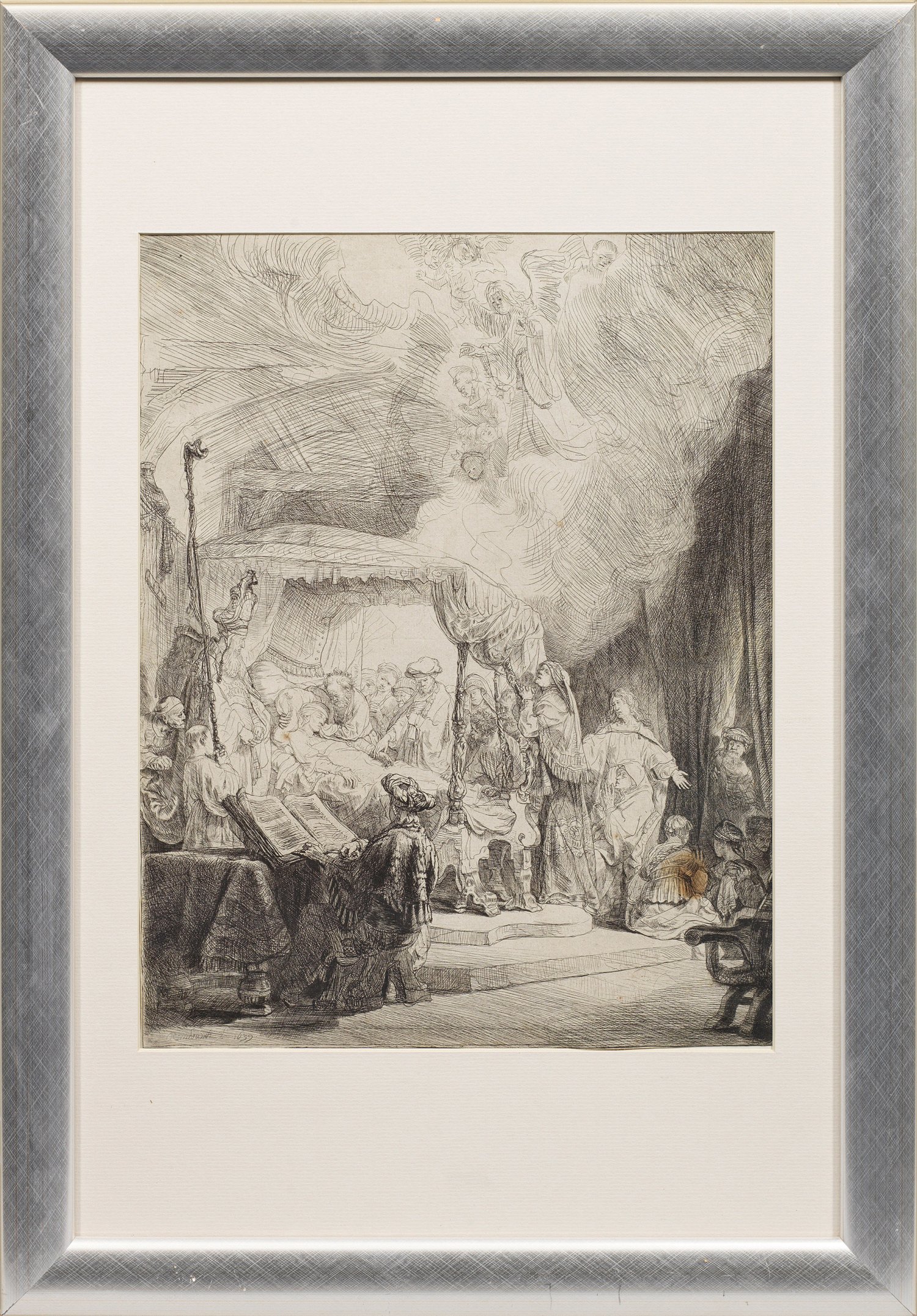 Radierung und Kaltnadel/Papier, um 1639. R. u. in der Platte sign. u. dat.; IV. Zustand von V (nach New Hollstein 173 IV/V) mit stark schattiertem Stuhl. Wasserzeichen Weintrauben und Text-Gegenmarke. Verso diverse Bez. sowie Sammlungsstempel in Blau (Lugt 5818). Vereinzelt stockfleckig. Bis zur Einfassungslinie beschnitten. Blatt 39,3 cm x 31,3 cm. Rahmen.