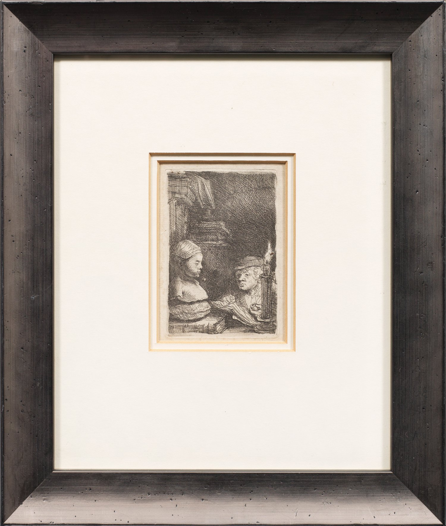 Radierung/Bütten, um 1641. Verso handschriftliche Bez. mit Dat. 1842 (wohl Sammlungshinweis). III. Zustand (nach Hollstein) mit den Überarbeitungen (nicht von Rembrandt) u. a. auf der Stirn der Büste, der Wange des Malers und der vormals weißen Stelle zwischen der Kerze und dem Buch. Hollstein B 130/III. Kleine reparierte Läsur. Platte 9,6 cm x 6,5 cm. Blatt 12,6 cm x 9,5 cm. Rahmen.