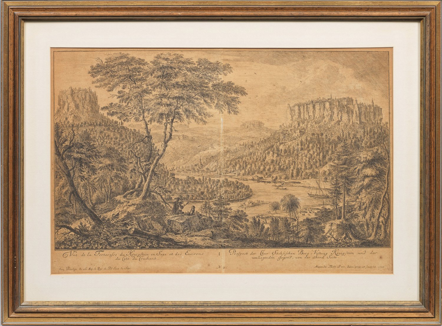 Radierung/Papier, 1726. Unterhalb sign. dat. und deutsch-französisch betitelt sowie mit Dedikation an August den Starken, Kurfürst von Sachsen und König von Polen. Blatt Nr. 2 aus der sechsteiligen Folge "Ansichten aus der sächsischen Schweiz". Gebräunt. Plattenmaß ca. 36 cm x 55 cm. Rahmen.