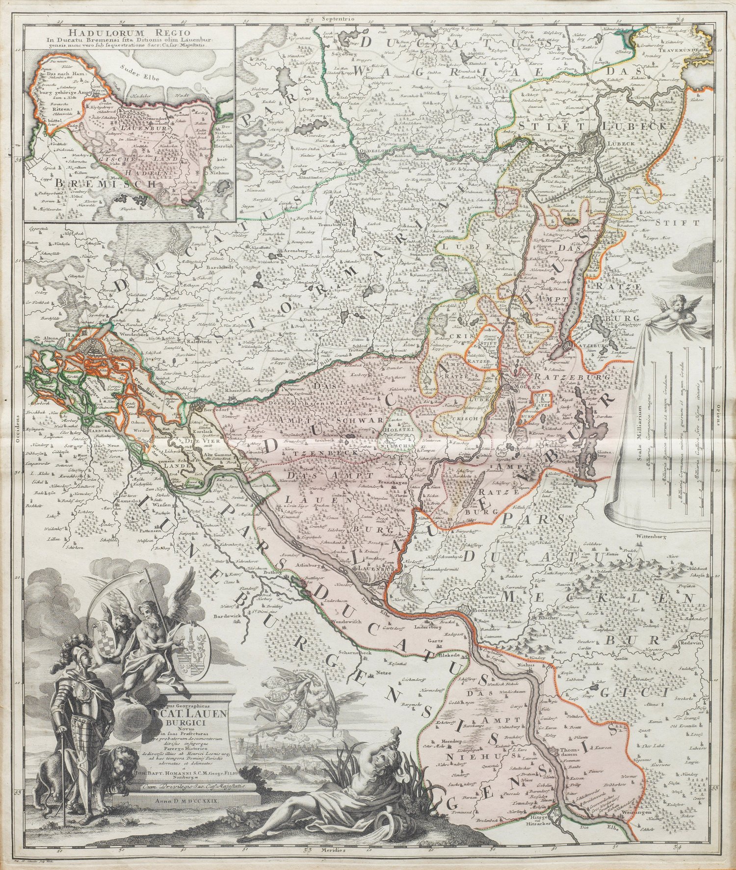 Teilkolorierter Kupferstich von Ruprecht Adam Schneider, erschienen bei Johann Christoph Homann Nürnberg (1703 - 1730), 1729. Karte des Herzogtums mit dem Stift Lübeck und dem Amt Ratzeburg. Links oben Nebenkarte von Hadeln und Ritzebüttel. Große, figürliche Kartusche mit Wappen. Platte 57 cm x 48,5 cm. Rahmen.