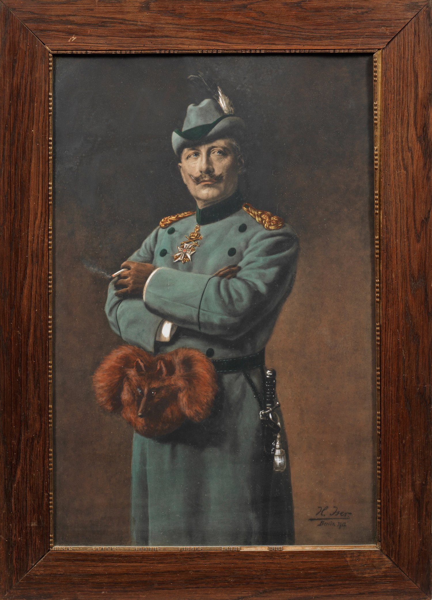 Im aufwendigen Chromolithograhie-Verfahren mit Weißhöhungen ausgeführtes, repräsentatives Bildnis nach einem Gemälde des 1909 zum preußischen Hofmaler ernannten Heinrich Iser. R. u. bez. u. dat. 1912 mit Ortsangabe Berlin. 80 cm x 105 cm. Original-Rahmen.