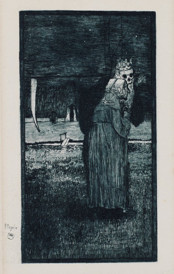 Radierung in Blaugrün/Bütten, 1896. In der Platte sign. mit Worpsweder Wappenschild. Wvz. Rief 11d. Min. lichtrandig. Darstellung 14,4 cm x 7,8 cm. Blatt 24,5 cm x 16,6 cm.