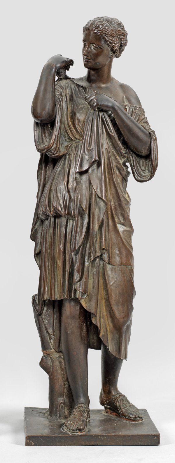 Bronze, dunkelbraun patiniert. Im Detail fein ausgeführter Guss des 19. Jhs. mit vollplastischer Darstellung nach der berühmten, antiken, 165 cm hohen Marmorskulptur im Louvre. Die aus dem 4. Jh. v. Chr. stammende Marmorstatue wird von einigen Forschern aufgrund ihres Stils und ihrer beeindruckenden künstlerischen Qualität dem griechischen Bildhauer Praxiteles zugeschrieben. Gefunden wurde sie 1792 von Gavin Hamilton auf den Grundstücken von Prinz Marcantonio IV. Borghese in der Nähe von Rom, wo sich einst die Stadt Gabi befand und sofort in die Sammlung des Prinzen aufgenommen. Finanzielle Schwierigkeiten zwangen die Familie Borghese die Skulptur 1807 zusammen mit 344 anderen Objekten an Kaiser Napoleon nach Frankreich zu verkaufen, aus dessen Besitz sie seit 1820 im Louvre zu sehen ist. Die klassische Statue wird im Allgemeinen wegen ihrer Kleidung als Artemis, Göttin der Jungfräulichkeit, der Jagd und des Waldes, identifiziert. Wegen ihrer außerordentlichen Schönheit und Qualität wurde die Skulptur im 19. Jh. sehr populär und auch als Repliken in Marmor, Bronze, Terrakotta und Porzellan für Kunstfreunde und -sammler vervielfältigt. H. 68 cm.