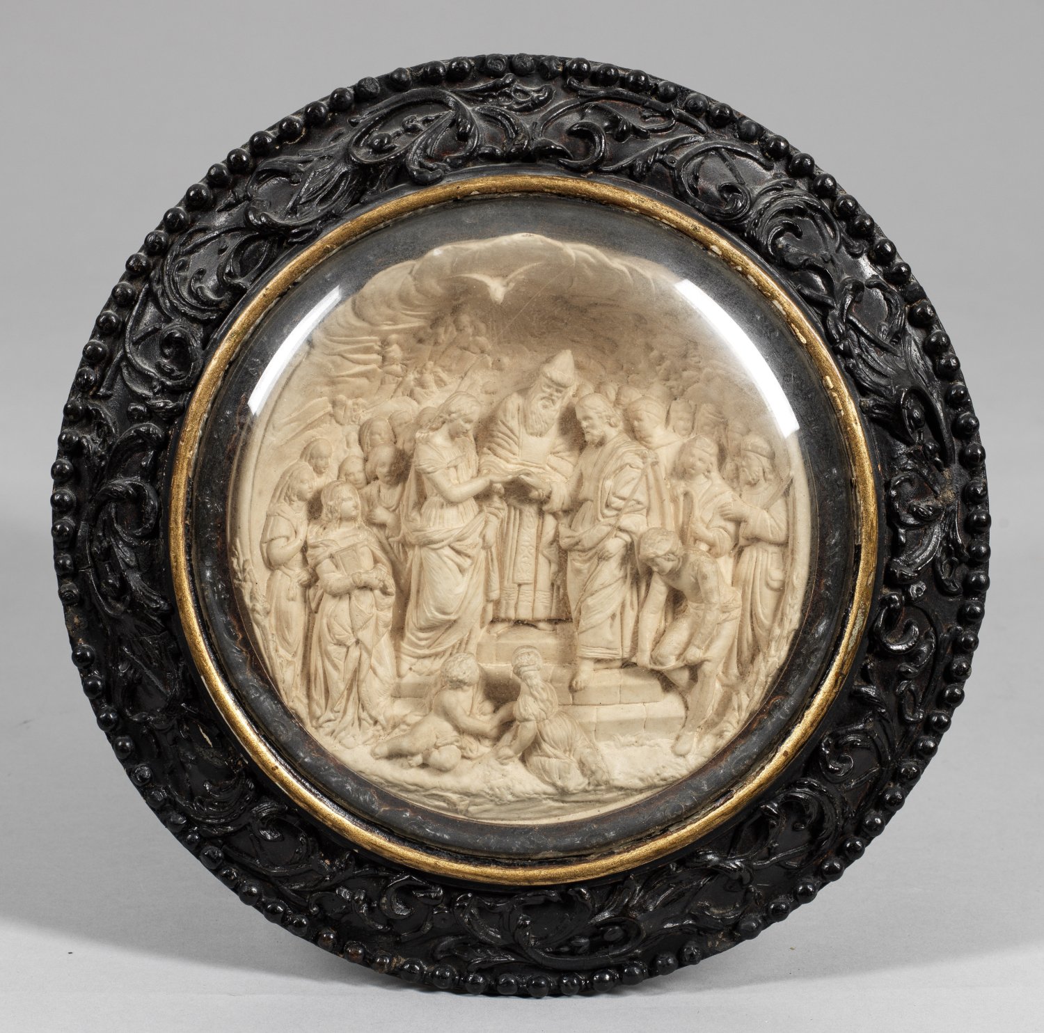 Stucco, elfenbeinfarben gefasst. Vielfigurige, szenische, in der Kulisse und in den Nebenfiguren abgewandelte Darstellung nach dem 1504 entstandenen Altargemälde "Sposalizio della Vergine" Raffaels, das heute in der Pinacoteca di Brera in Mailand hängt. In verglastem, ebonisiertem Rahmen. Relief-D. ca. 17 cm; Ges.-D. ca. 27,5 cm.