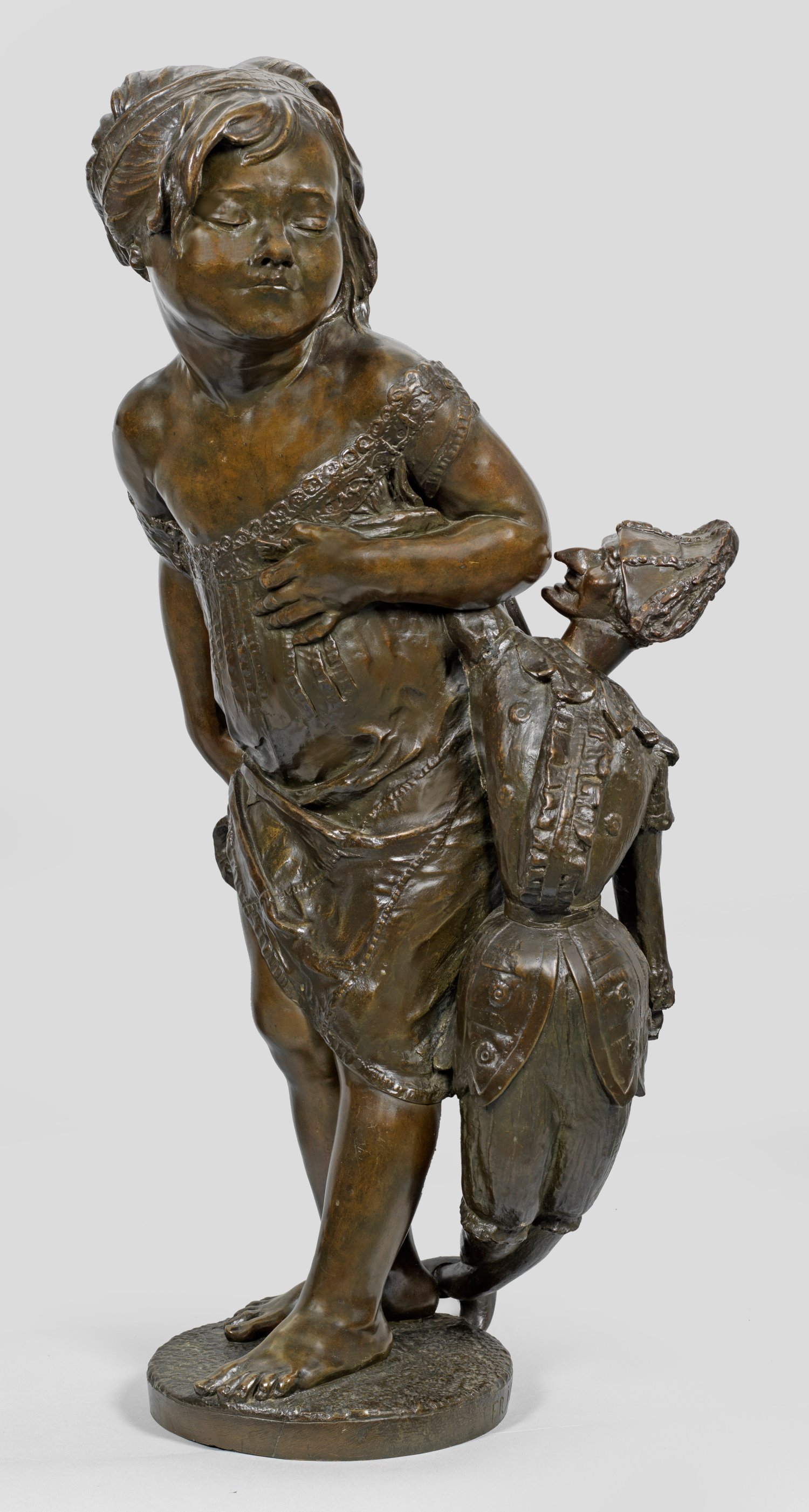 Bronze, braun patiniert. Sign.; Auf einer runden Plinthe stehendes, sich etwas vorbeugendes Mädchen in leichtem Kleid, mit der linken Hand eine große Harlekin-Puppe haltend, deren Kopf abnehmbar ist. Joris studierte seit 1871 bei Jozef Geefs an der Koninklijke Academie voor Schone Kunsten in Antwerpen. 1877 erhielt er eine lobende Erwähnung im Wettbewerb um den Rom-Preis; seit 1883 lehrte er selbst an der Akademie in Antwerpen. Joris schuf außer Denkelmälern, Porträts, weiblichen Büsten und allegorischen Figuren vornehmlich Skulpturen und Bronzeplastiken mit Darstellungen junger, unbefangener Mädchen. H. 86 cm.