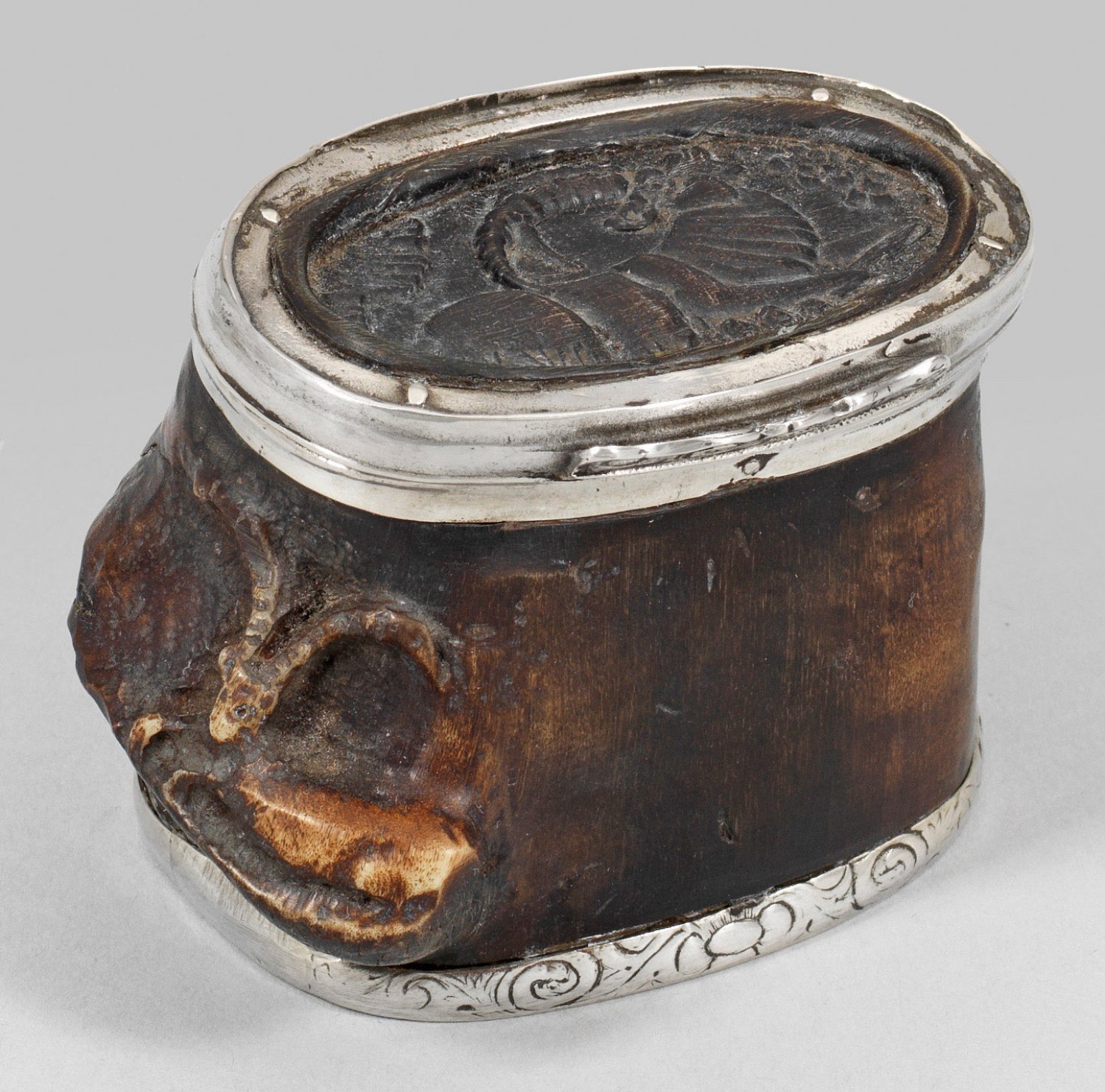 Horn, geschnitzt und Silber. Ovoid, mit flachem scharniertem Deckel und geschweifter Daumenrast. Silbermontierung teilw. mit graviertem, floralem Dekor verziert. Auf der Wandung stilisiert geschnitzter, liegender Steinbock auf einem Felsvorsprung. Deckel und Unterseite mit Darstellung eines ruhenden Steinbocks sowie einer ruhenden Gams. H. 5 cm.