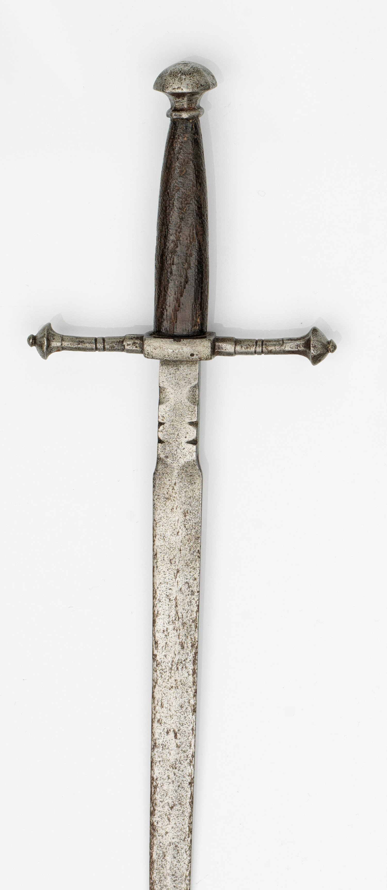 Schlanke, zweischneidige und spitz zulaufende Klinge mit abgeflachtem Mittelgrat und kräftiger, gekehlter Fehlschärfe. Gerade Parierstange mit balusterknaufförmigen, facettierten Abschlüssen. Konischer Holzgriff mit korrespondierend facettiertem Halbkugelknauf. L. 34 cm.