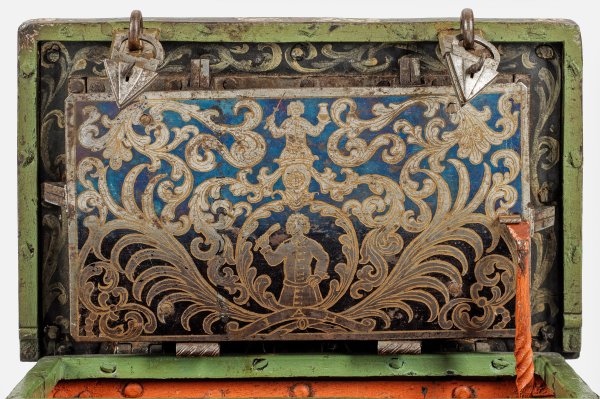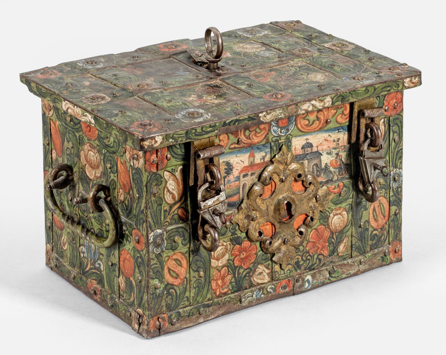 Eisen, polychrom gefasst. Rechteckiger Korpus mit flachem Scharnierdeckel und seitlichen, beweglichen Handhaben. Korpus und Deckel mit über Kreuz vernieteten Bandbeschlägen. Frontseitig zwei Überfallriegel mit dreieckigen Vorhängeschlössern. Zentral aufgelegtes Kartuschenmotiv mit Scheinschloss. Wandung grün gefasst und umlaufend mit roten und weißen Blüten, Blattranken sowie auf der Schauseite mit Häusern, Bäumen und Schiffen verziert. Zentrales, verdecktes Schloss auf dem Deckel. Innen rot bemalt. Auf Deckelinnenseite die fein ziselierte, teilw. vergoldete und gebläute, rechteckige Schlossabdeckplatte zentral mit stilisierter Helmzier und zwei Männerdarstellungen, gerahmt von üppigen Akanthusblattranken. Vier Zuhaltungen. Drei Schlüssel. H. 20 cm. 33 cm x 21 cm.