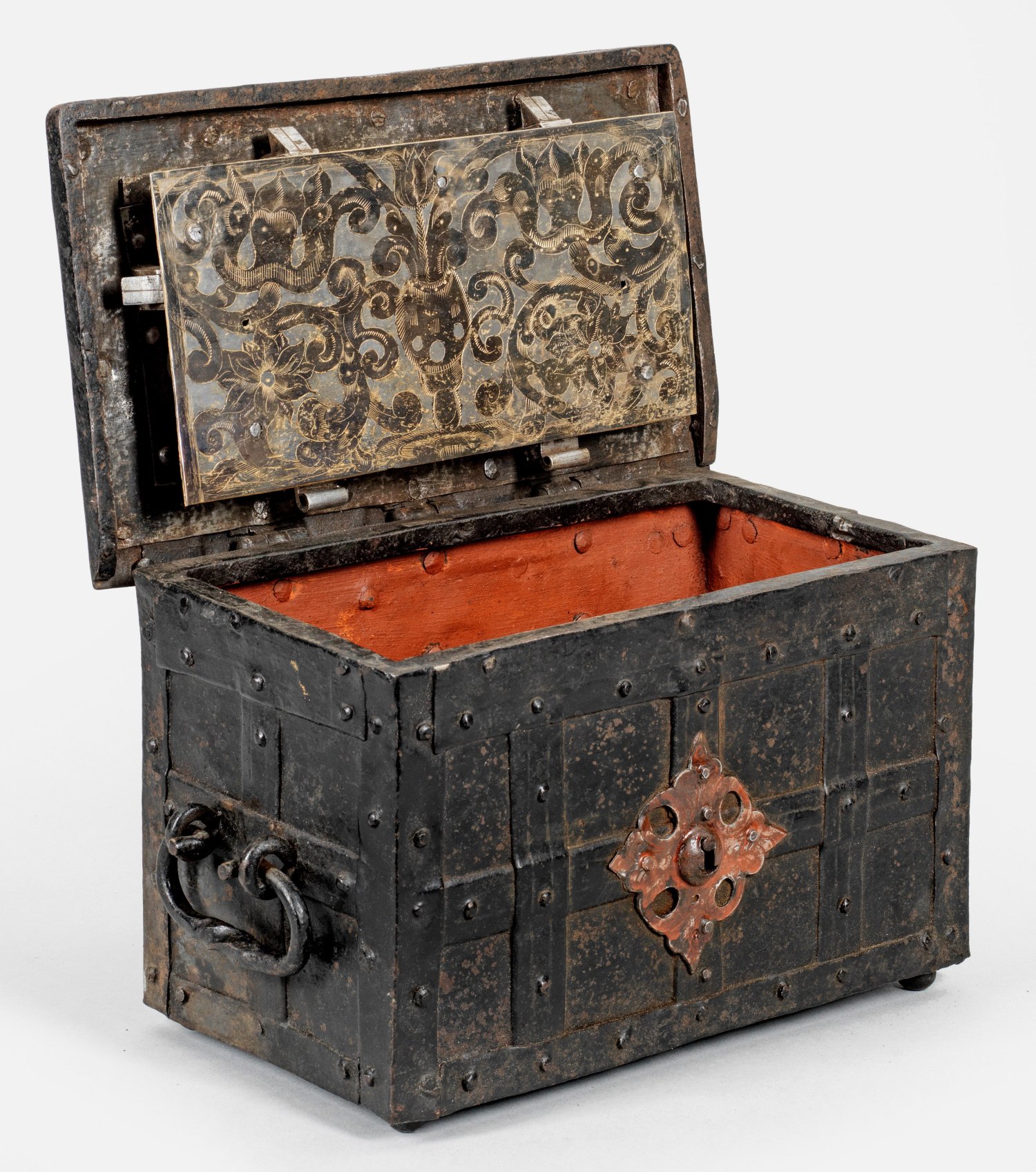 Eisen. Auf vier Kugelfüßen rechteckiger Korpus mit flachem Scharnierdeckel und seitlichen, beweglichen Handhaben. Korpus und Deckel mit über Kreuz vernieteten Bandbeschlägen. Frontseitig zentral aufgelegtes und rot gefasstes Kartuschenmotiv mit Scheinschloss. Verdecktes Schloss auf dem Deckel. Innen rot bemalt. Auf Deckelinnenseite die fein ziselierte, teilw. vergoldete und gebläute, rechteckige Schlossabdeckplatte mit stilisierten Blattranken und Tulpenblüte. Vier Zuhaltungen. Mit Hohldornschlüssel. H. 21 cm. 33,5 cm x 19,5 cm.