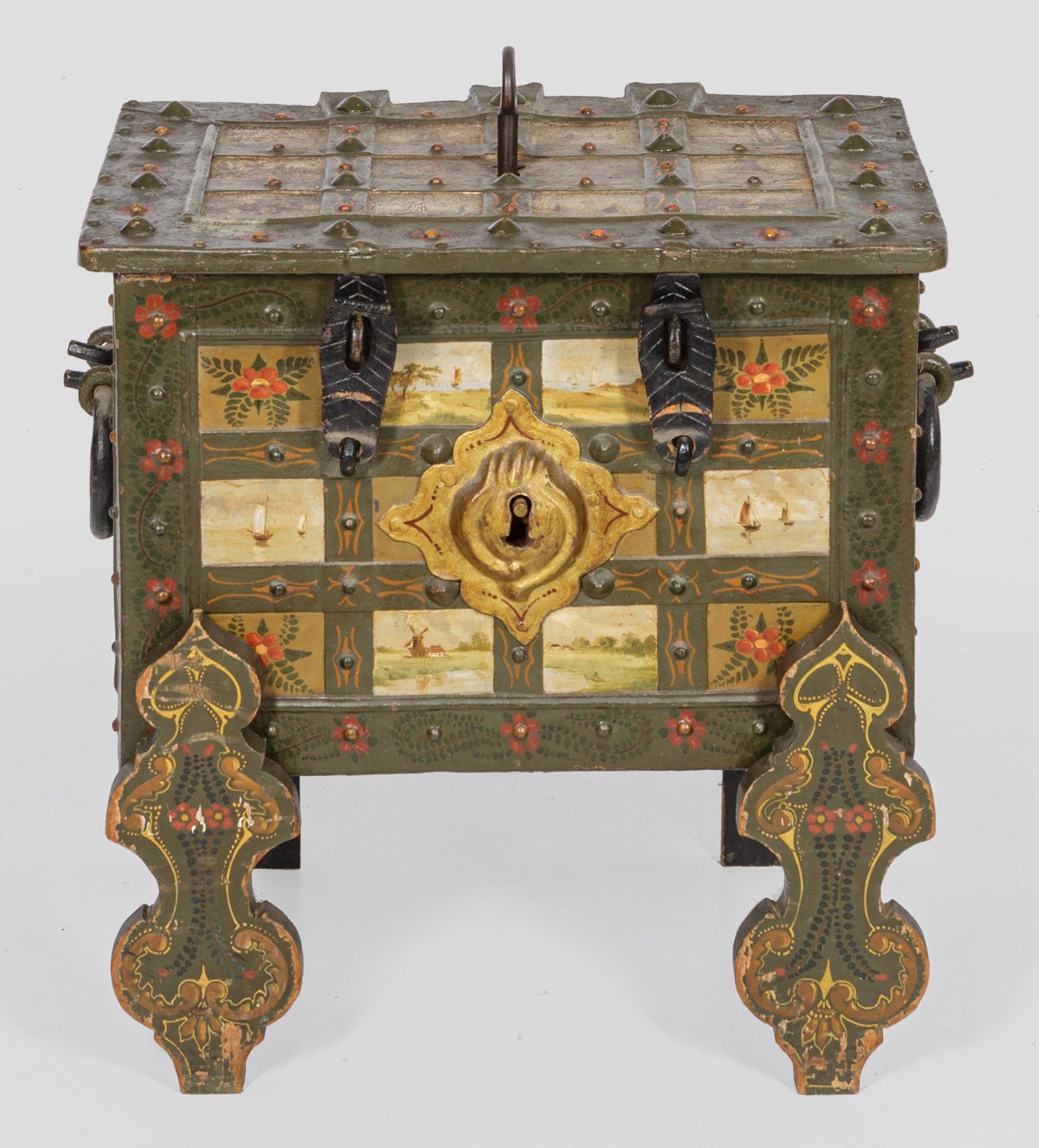 Schmiedeeisen, polychrom gefasst. Gerader, querrechteckig angelegter Korpus, flächendeckend umspannt aus breiten genieteten Bändern mit seitlichen Griffen. Aufklappbarer Flachdeckel mit zentralem Schloss. Unterhalb verdeckter Schließmechanismus mit fünf Zuhaltungen. Dazu Stand mit Balusterstützen. Dekor aus Windmühlen, Segelbooten und Blüten. Ges.-H. 68,5 cm. Schatullen-H. 37 cm. 54 cm x 39 cm.