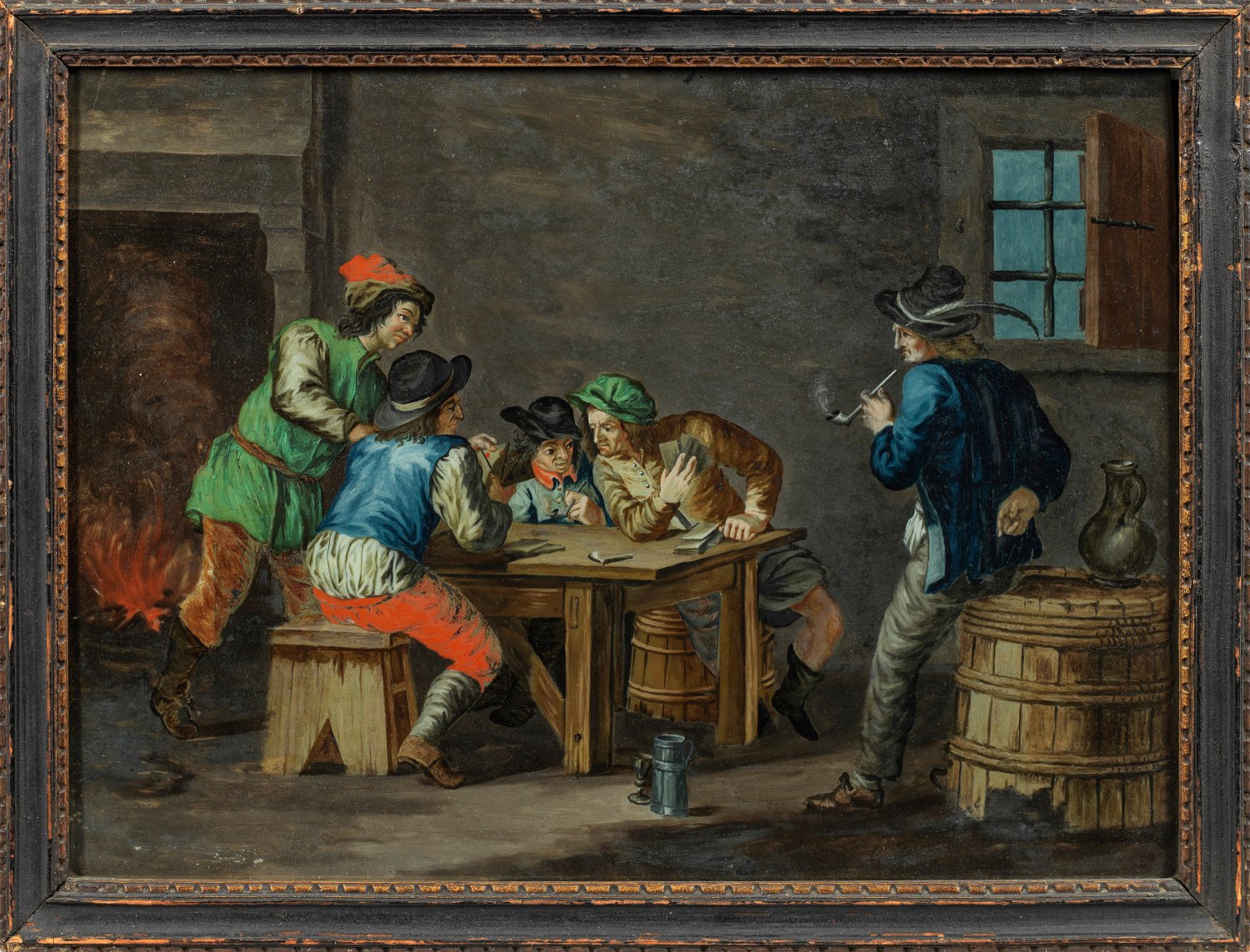 Szenisch stimmungsvolle Darstellung einer geselligen Gruppe Männer mit Hüten in einem Wirtshaus sitzend und Karten spielend. Im Hintergrund der brennende Kamin. Rechts vorne ein Mann, eine Pfeife rauchend und an ein Holzfass angelehnt den Spielenden zusehend. Darstellung wohl nach Adriaen Brouwer (1606 -1638). Polychrome Hinterglasmalerei. Reliefierter Rahmen mit Restvergoldung. 45 cm x 33 cm.