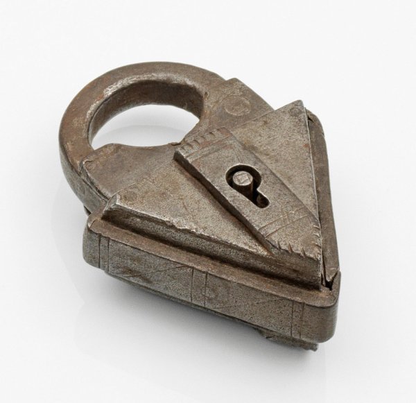Eisen. Dreieckig, vorder- und rückseitig verstärkt durch breite Leisten. Halbrunder, übergreifender Bügel. Schlüssel fehlt. H. 10 cm.