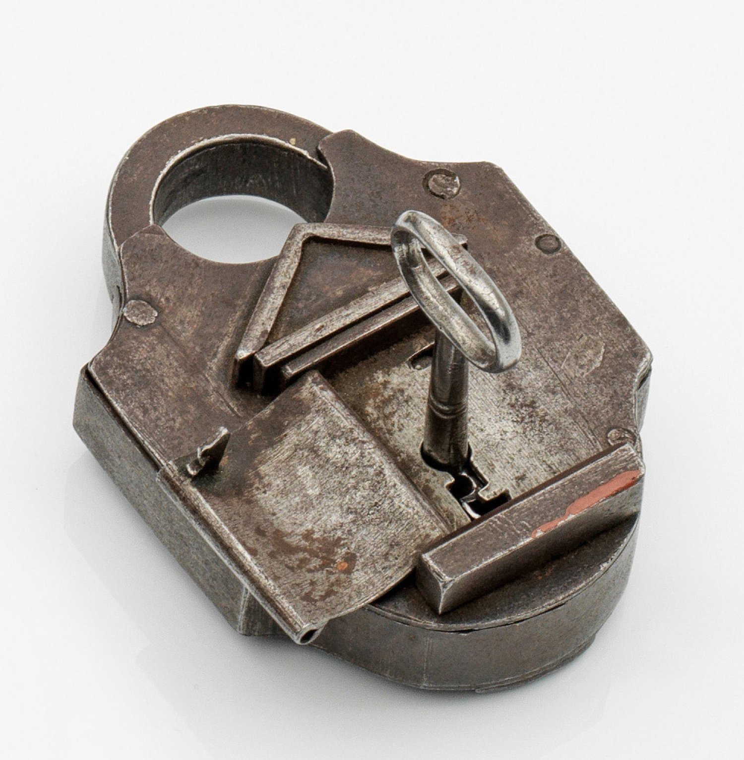 nach sog. "Wiener Art". Eisen. Passiger, schildförmiger Korpus. An der Vorderseite verdecktes Schlüsselloch hinter zentral angebrachtem, scharniertem Türchen. Rückseitig vertikal angebrachter Schieber zum Öffnen des halbrunden, übergreifenden Bügelverschlusses. Dabei Hohldornschlüssel. H. 11 cm.