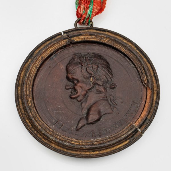 A French turned wooden medaillon with the portrait of the Roman emperor Vespasian (Titus Flavius Vespasianus). Flaws to the frame. Label "PINTO COLLECTION" on the reverse.